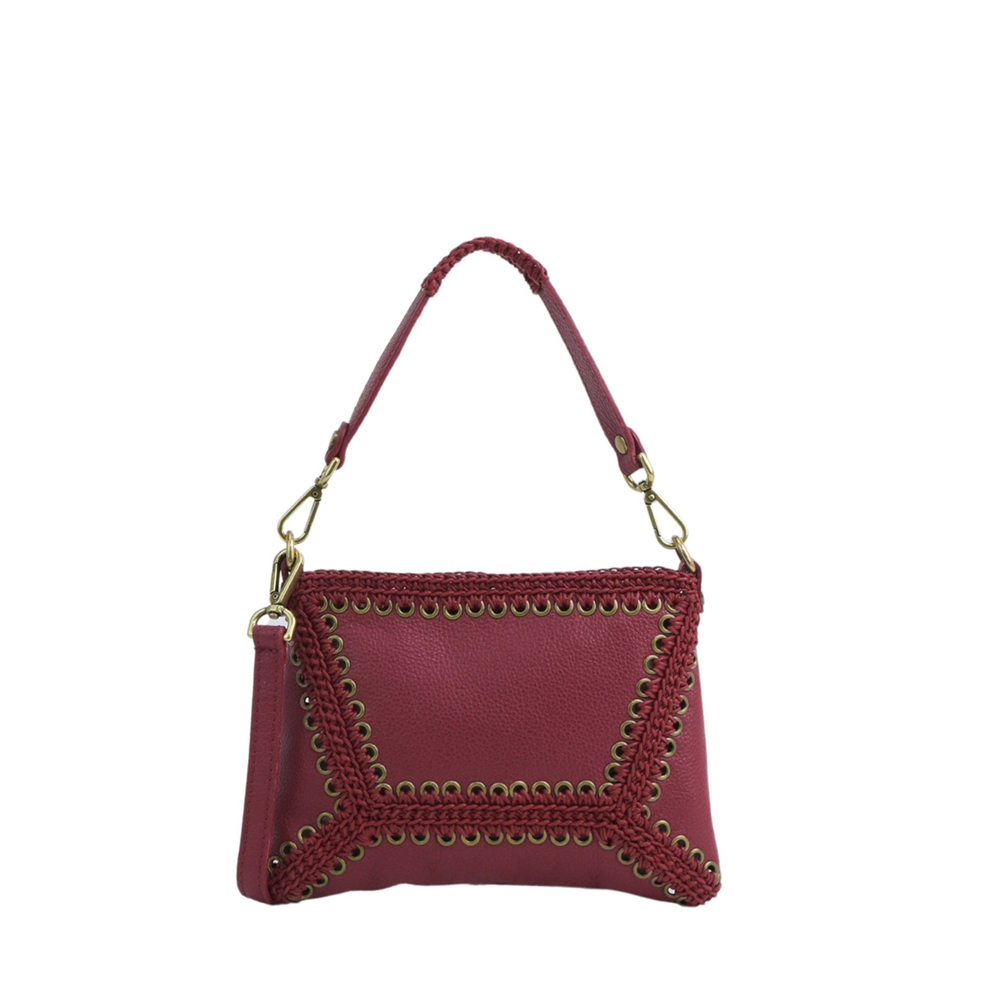 Atena è una borsa media, realizzata cucendo a mano all'uncinetto pannelli di pelle con una forma a trapezio. Tutto il lavoro all'uncinetto è realizzato con un cordoncino coda di topo, molto resistente. La pelle è di vitello con un tocco delicato. L'interno della borsa ha la parte in pelle foderata in un unico pezzo e si possono vedere tutte le lavorazioni. Ha un comodo manico estraibile da portare a spalla lavorato. Oltre a una tracolla allungabile, in modo da poterla indossare come borsa a spalla o come borsa a tracolla e a bandoliera. Si può indossare anche come busta a mano. All'interno si trovano una tasca con cerniera e due tasche aperte. La parte superiore della borsa è chiusa da una zip.