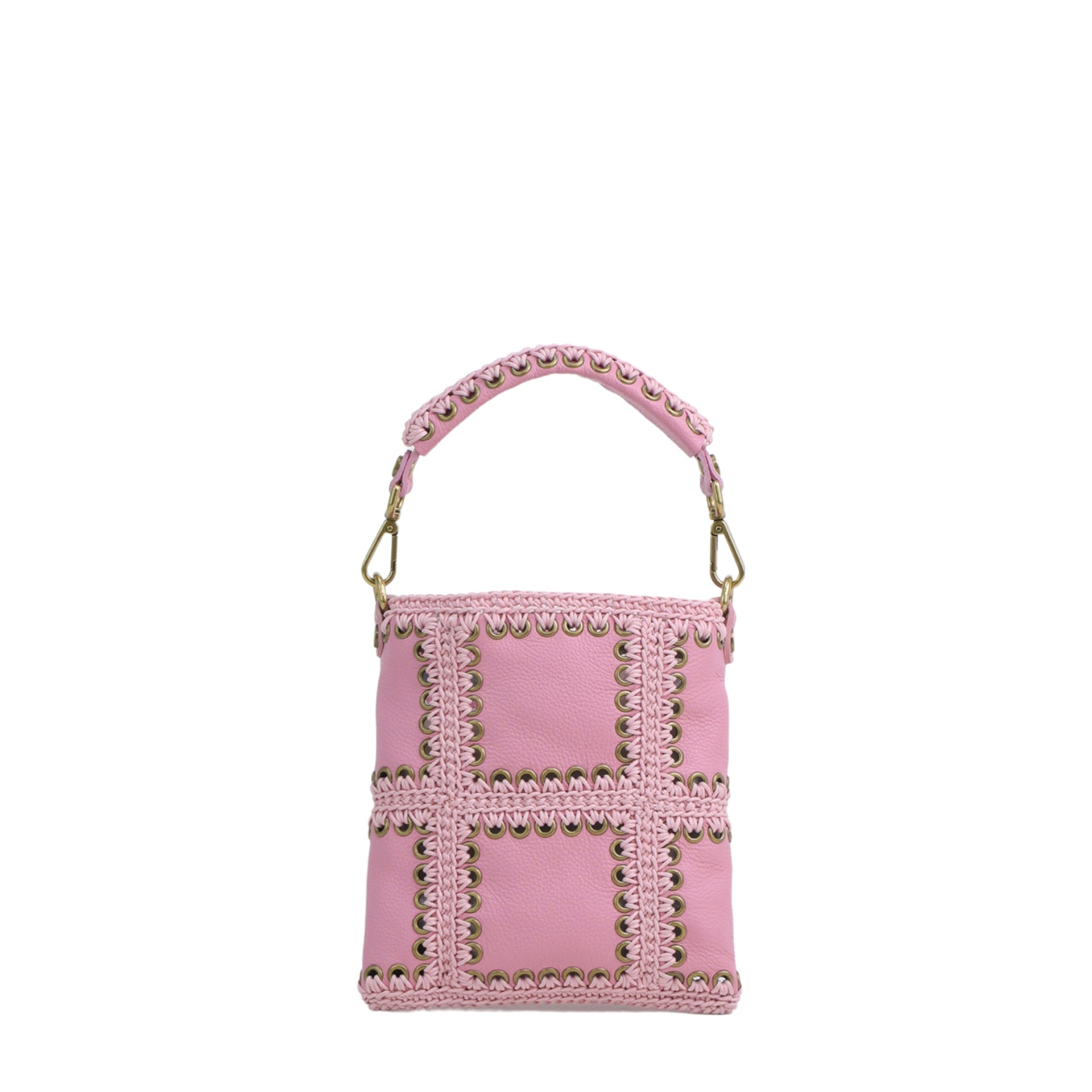 Clara è una borsa mini realizzata cucendo a mano all'uncinetto i pannelli quadrati di pelle infine uniti a formare i pannelli. Tutto il lavoro all'uncinetto è realizzato con un cordoncino coda di topo, molto resistente. La pelle è di vitello con un tocco delicato. L'interno della borsa ha la parte in pelle foderata in un unico pezzo e si possono vedere tutte le lavorazioni. Ha un comodo manico estraibile da portare a spalla lavorato. Oltre a una tracolla allungabile, in modo da poterla indossare come borsa a spalla o come borsa a tracolla e a bandoliera. Si può indossare anche come busta a mano. All'interno si trovano una tasca aperta. La parte superiore della borsa è chiusa da una calamita.