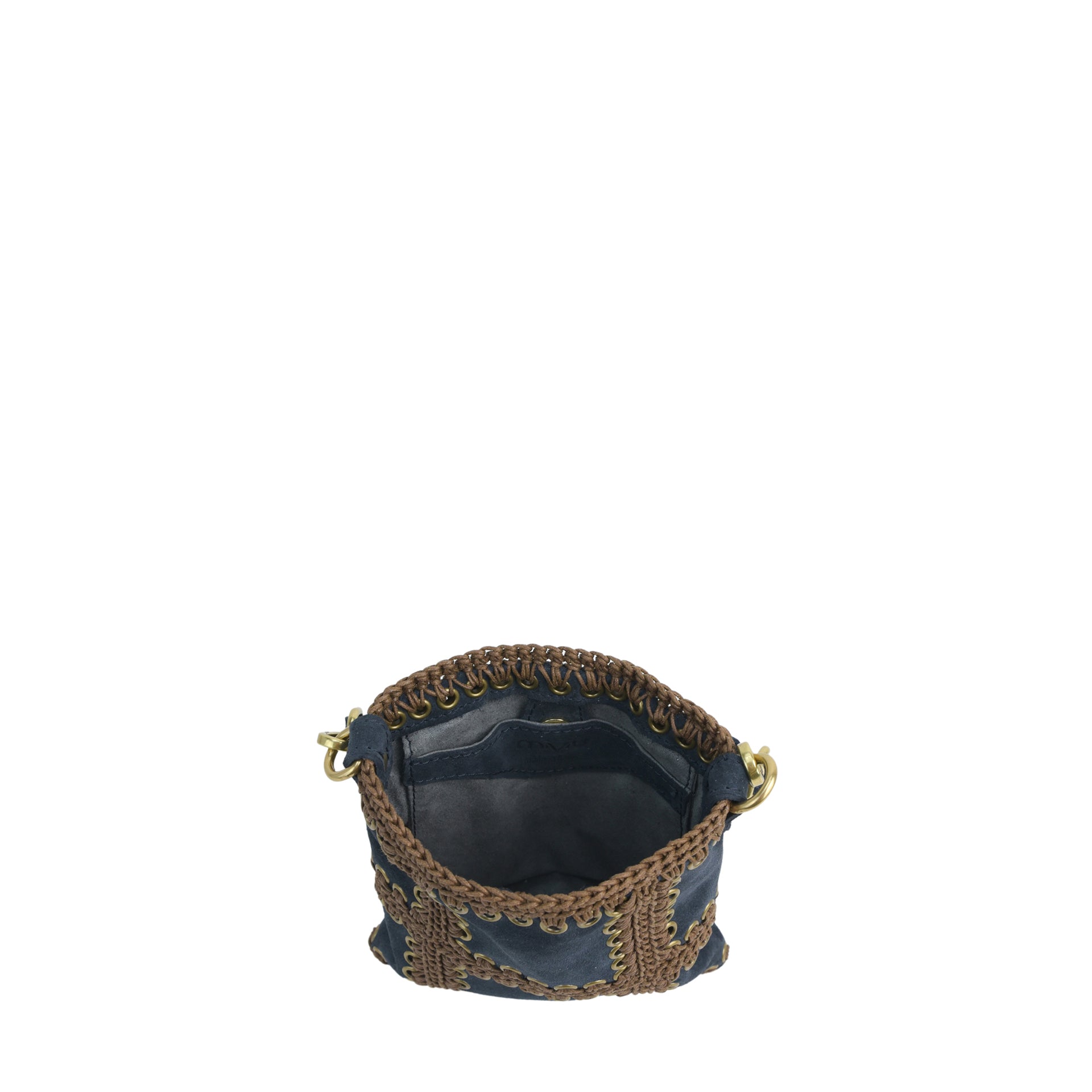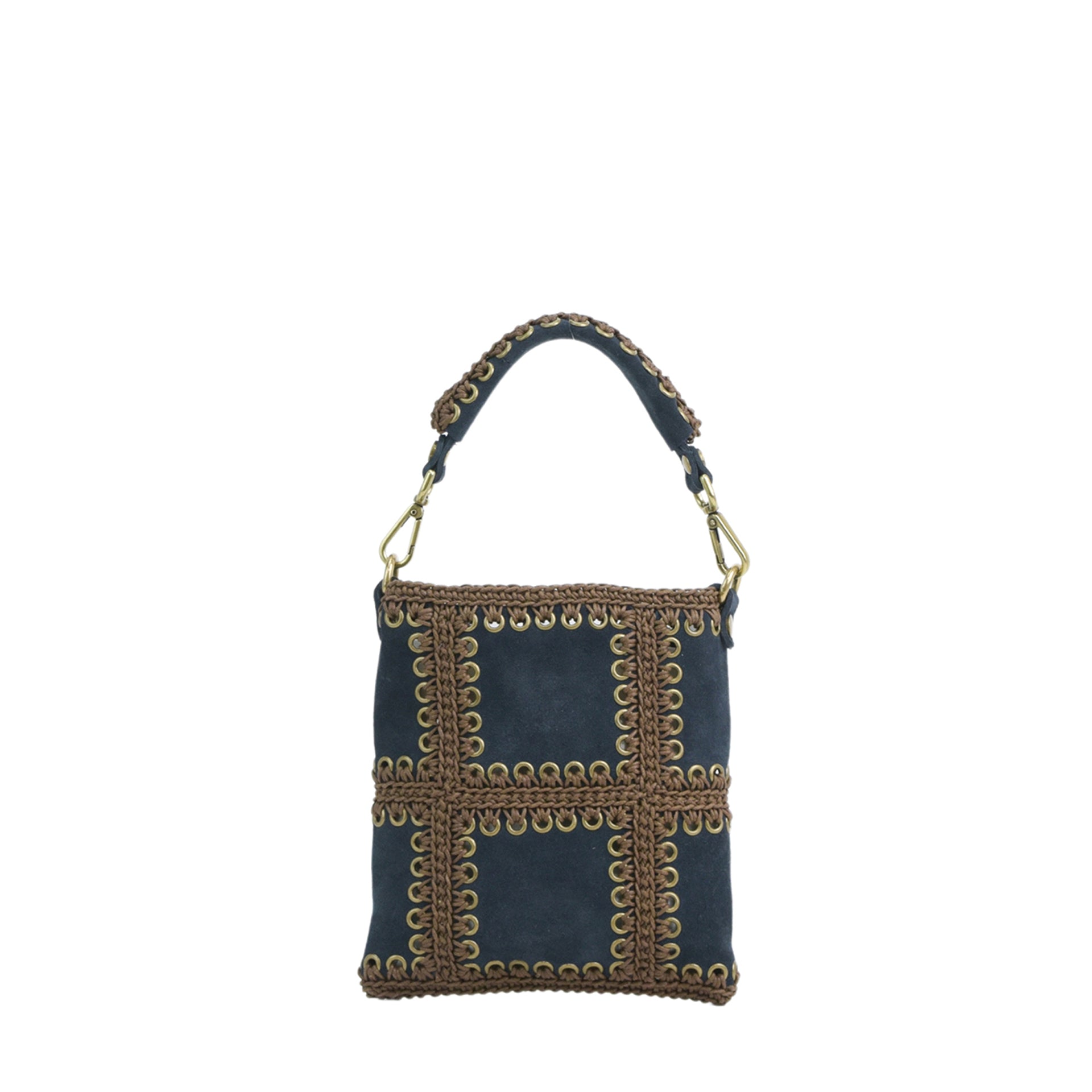 Clara è una borsa mini realizzata cucendo a mano all'uncinetto i pannelli quadrati di pelle infine uniti a formare i pannelli. Tutto il lavoro all'uncinetto è realizzato con un cordoncino coda di topo, molto resistente. La pelle è di vitello suede con un tocco delicato. L'interno della borsa ha la parte in pelle foderata in un unico pezzo e si possono vedere tutte le lavorazioni. Ha un comodo manico estraibile da portare a spalla lavorato. Oltre a una tracolla allungabile, in modo da poterla indossare come borsa a spalla o come borsa a tracolla e a bandoliera. Si può indossare anche come busta a mano. All'interno si trovano una tasca aperta. La parte superiore della borsa è chiusa da una calamita.
