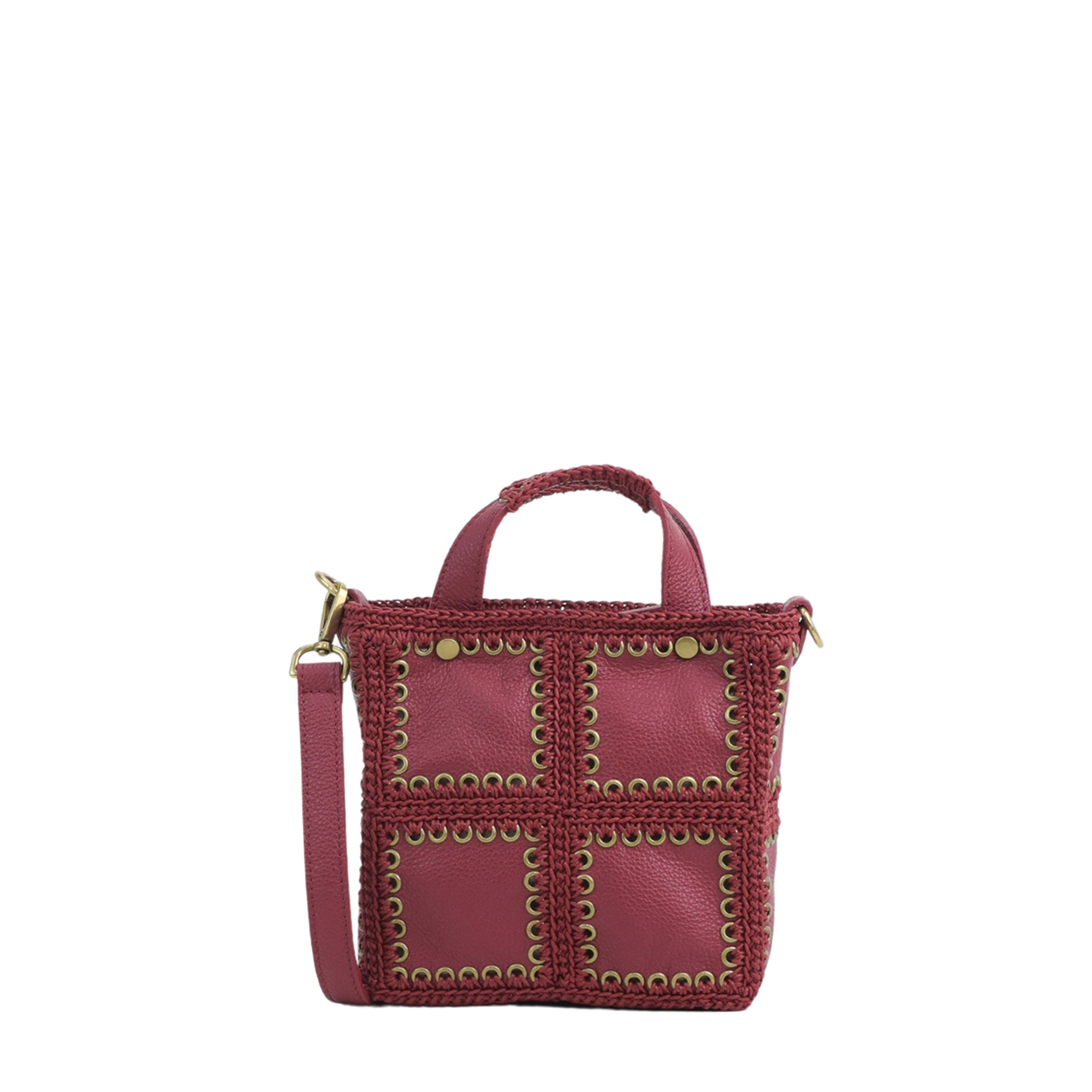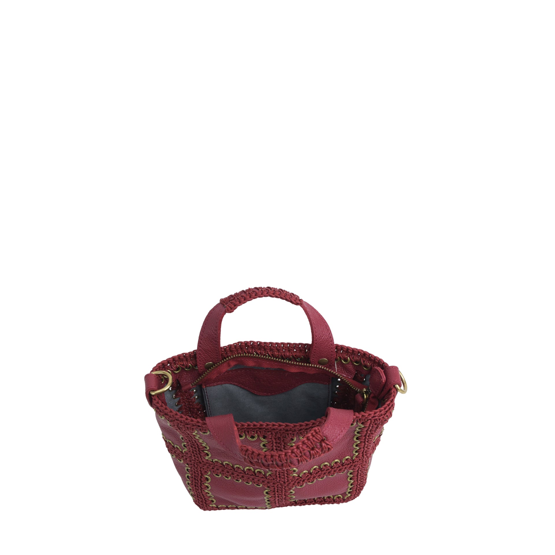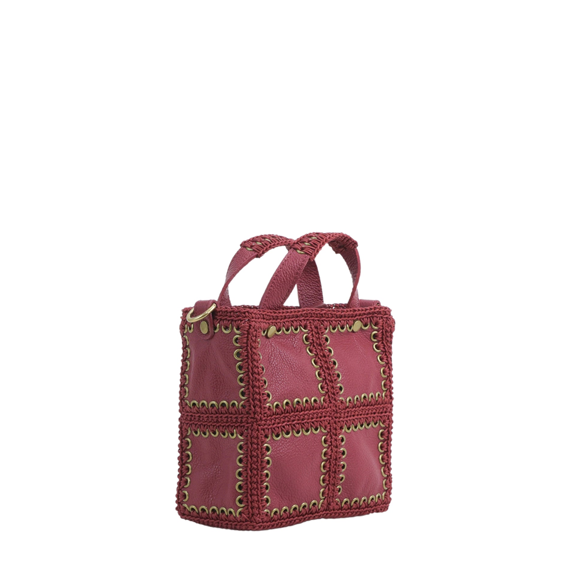 Demetra è una borsa media di forma quadrata realizzata cucendo a mano all'uncinetto i pannelli quadrati di pelle infine uniti a formare i pannelli. Tutto il lavoro all'uncinetto è realizzato con un cordoncino di cotone cerato, molto resistente. La pelle è di vitello con un tocco delicato. L'interno della borsa ha la parte in pelle foderata in un unico pezzo e si possono vedere tutte le lavorazioni. Da portare a mano con due manici anch’essi lavorati, oltre ad una tracolla allungabile, in modo da poterla indossare come borsa a mano o a tracolla e a bandoliera. All'interno si trova una tasca aperta. La parte superiore della borsa è chiusa da una lampo.