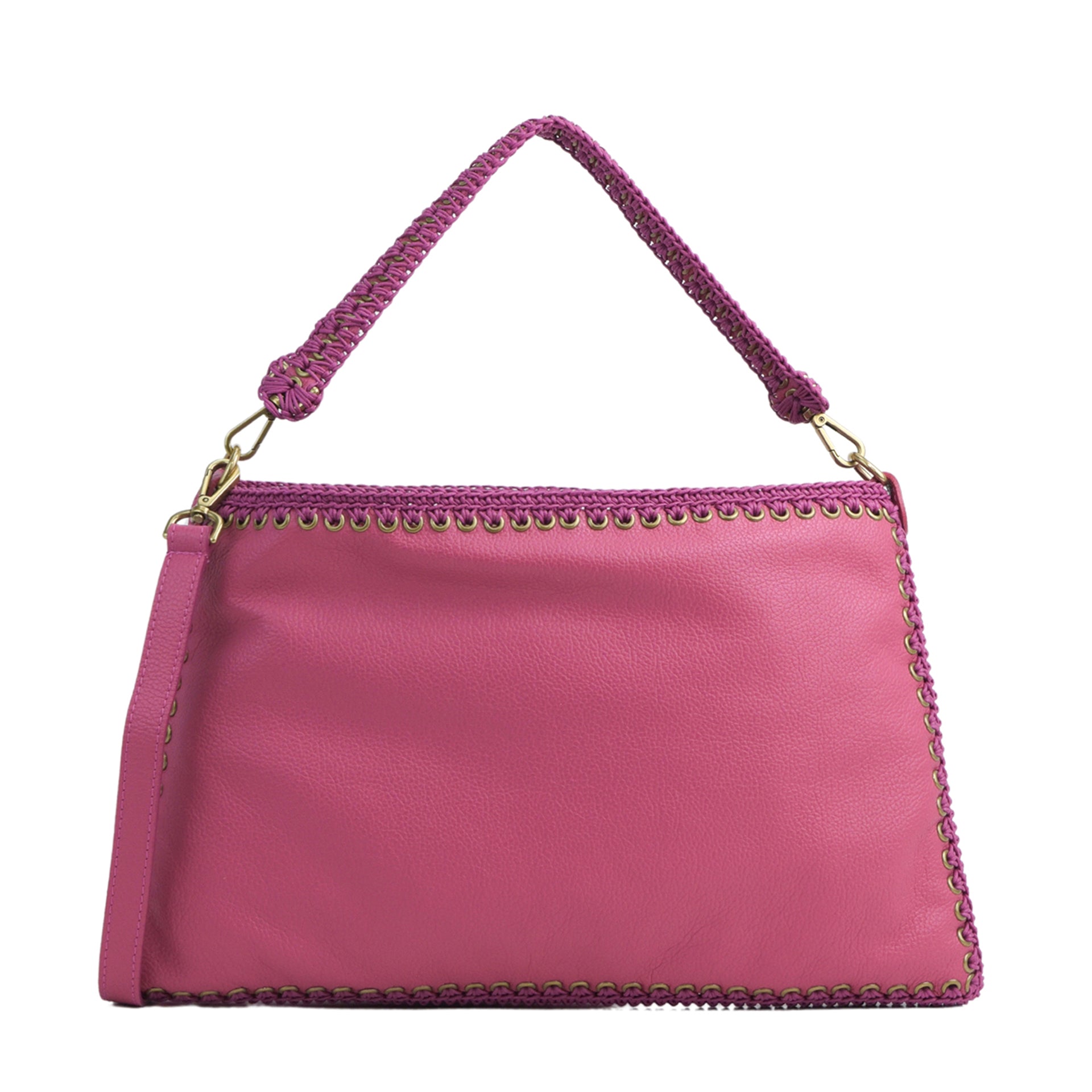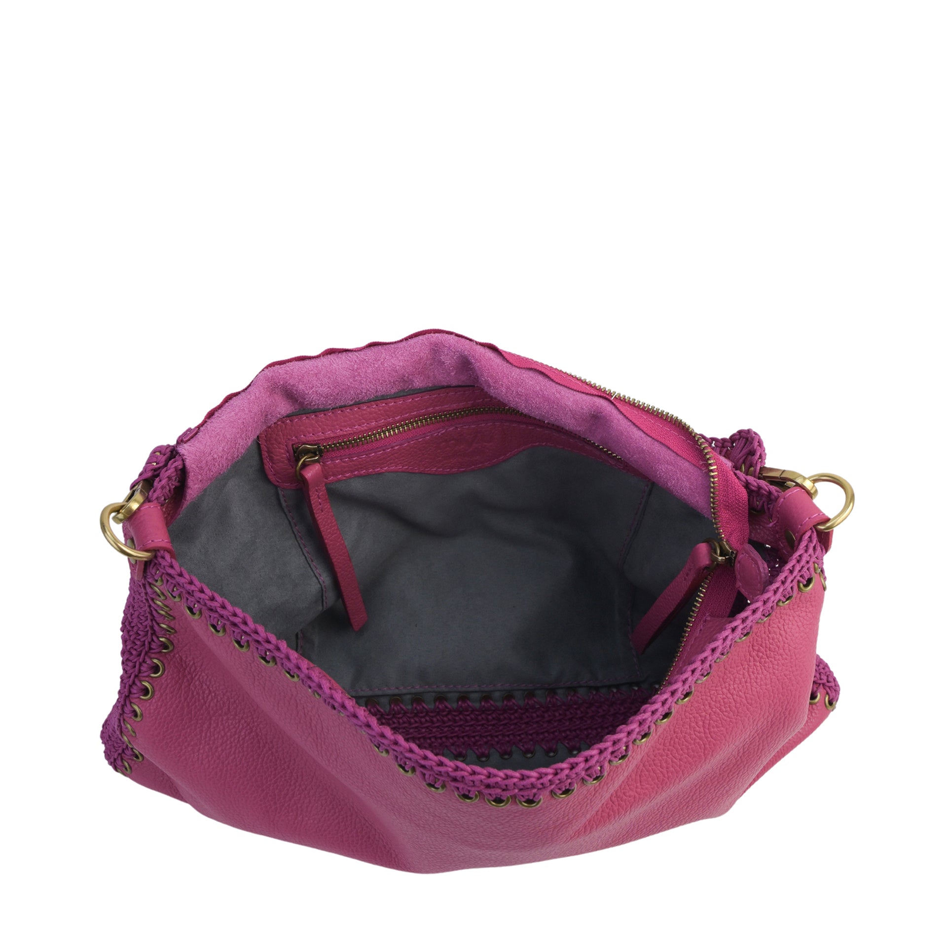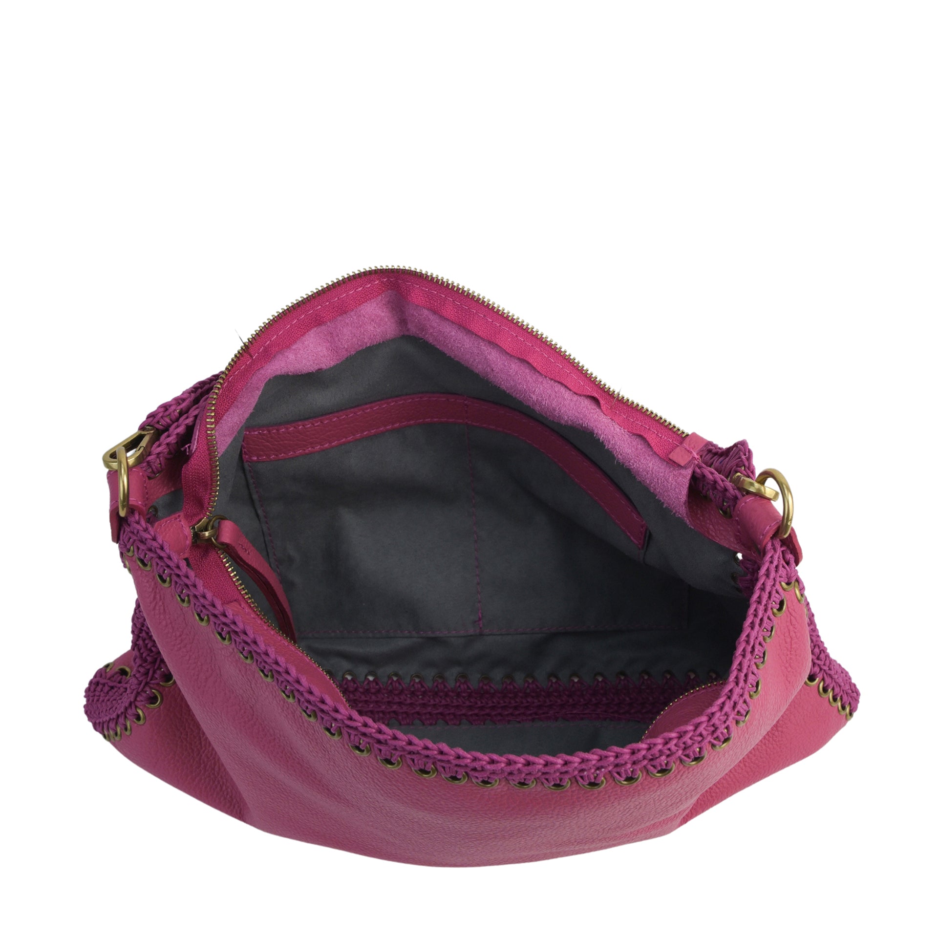 Ester è una borsa media, realizzata cucendo a mano all'uncinetto i pannelli di pelle. Tutto il lavoro all'uncinetto è realizzato con un cordoncino coda di topo, molto resistente. La pelle è di vitello con un tocco delicato. L'interno della borsa ha la parte in pelle foderata in un unico pezzo e si possono vedere tutte le lavorazioni. Ha un comodo manico estraibile da portare a spalla lavorato. Oltre a una tracolla allungabile, in modo da poterla indossare come borsa a spalla o come borsa a tracolla e a bandoliera. Si può indossare anche come busta a mano. All'interno si trovano una tasca con cerniera e due tasche aperte. La parte superiore della borsa è chiusa da una zip.