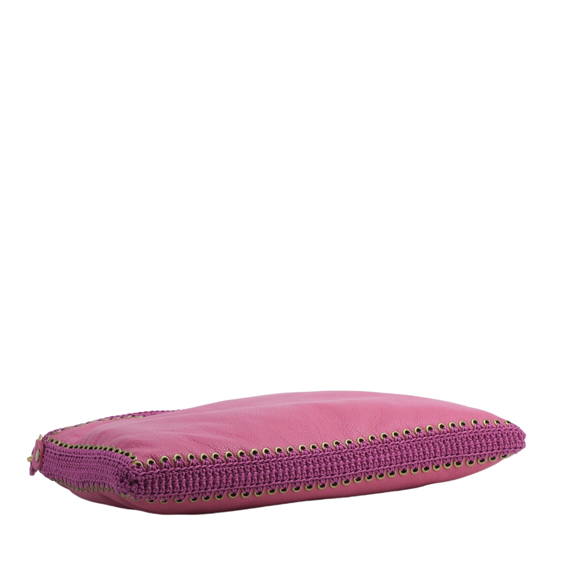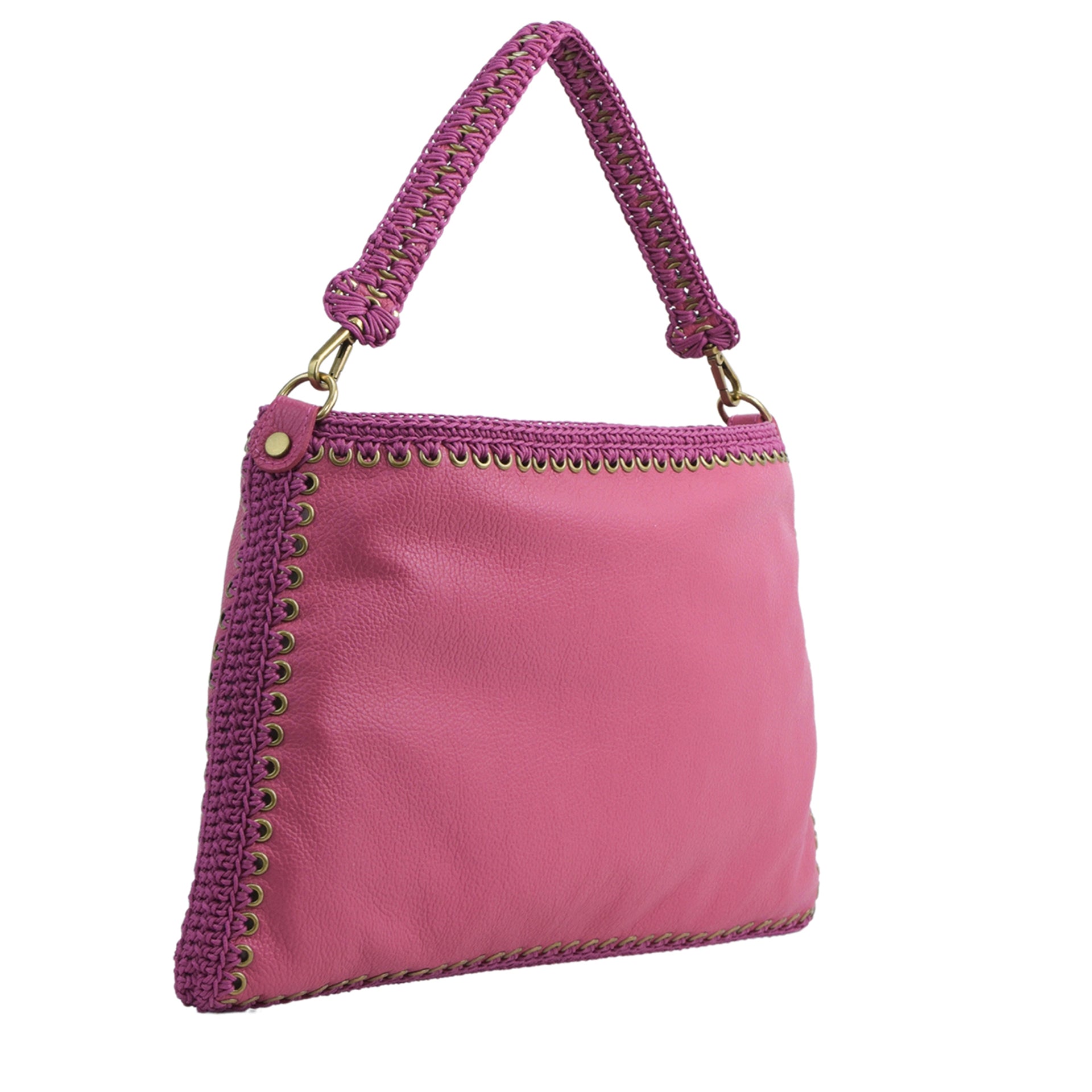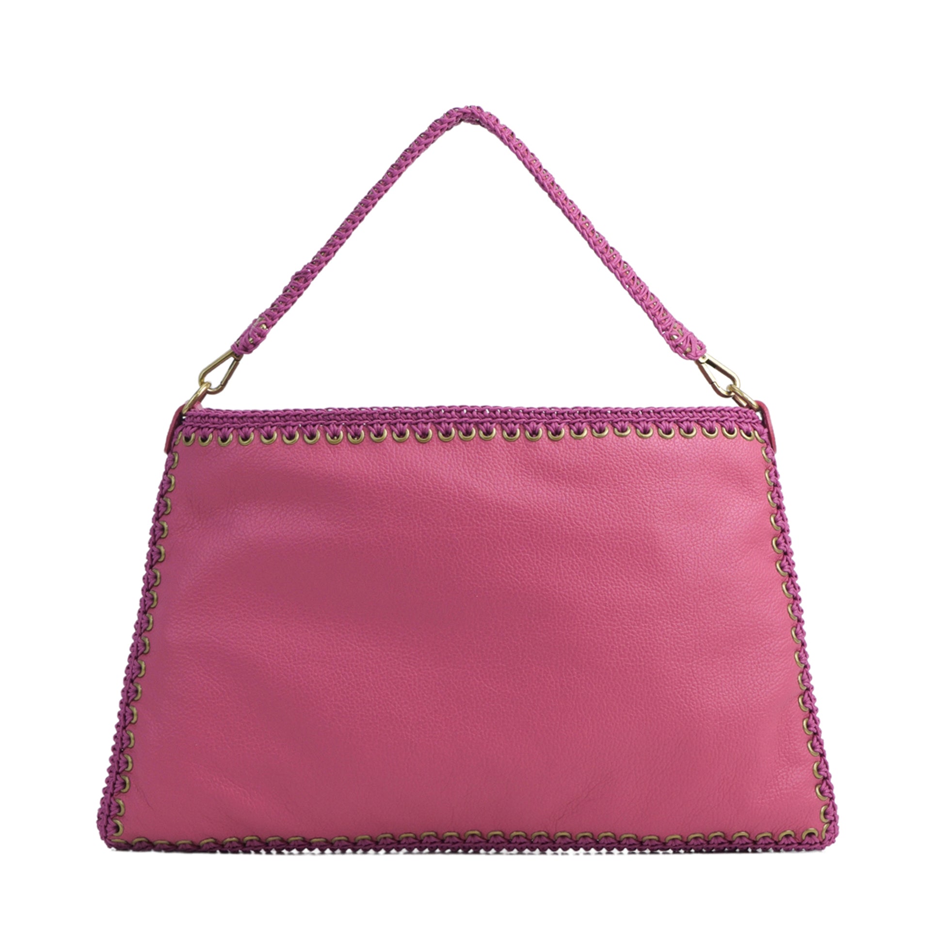 Ester è una borsa media, realizzata cucendo a mano all'uncinetto i pannelli di pelle. Tutto il lavoro all'uncinetto è realizzato con un cordoncino coda di topo, molto resistente. La pelle è di vitello con un tocco delicato. L'interno della borsa ha la parte in pelle foderata in un unico pezzo e si possono vedere tutte le lavorazioni. Ha un comodo manico estraibile da portare a spalla lavorato. Oltre a una tracolla allungabile, in modo da poterla indossare come borsa a spalla o come borsa a tracolla e a bandoliera. Si può indossare anche come busta a mano. All'interno si trovano una tasca con cerniera e due tasche aperte. La parte superiore della borsa è chiusa da una zip.