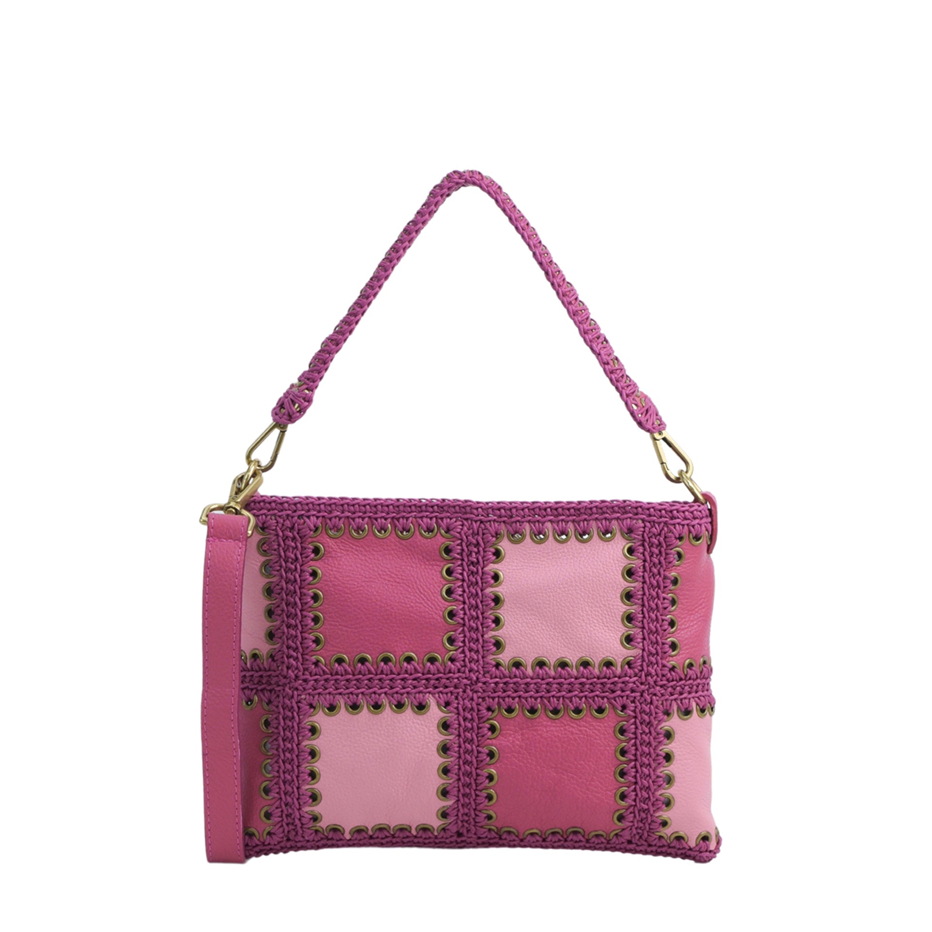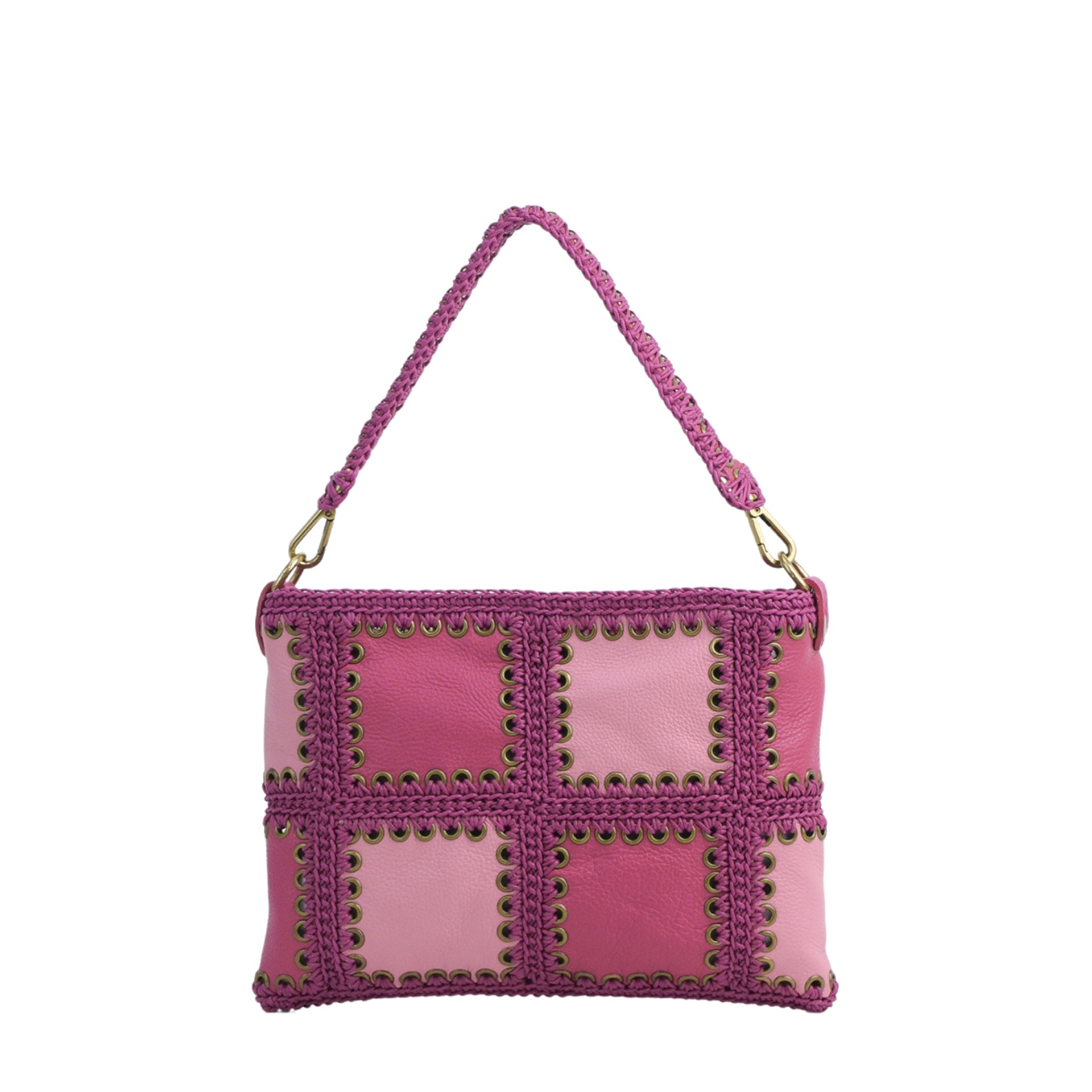 Glenda è una borsa media realizzata cucendo a mano all'uncinetto i pannelli quadrati di pelle infine uniti a formare i pannelli. Tutto il lavoro all'uncinetto è realizzato con un cordoncino di cotone cerato, molto resistente. La pelle è di vitello con un tocco delicato. L'interno della borsa ha la parte in pelle foderata in un unico pezzo e si possono vedere tutte le lavorazioni. Ha un comodo manico estraibile da portare a spalla lavorato. Oltre a una tracolla allungabile, in modo da poterla indossare come borsa a spalla o come borsa a tracolla e a bandoliera. Si può indossare anche come busta a mano. All'interno si trova una tasca aperta. La parte superiore della borsa è chiusa da una lampo.