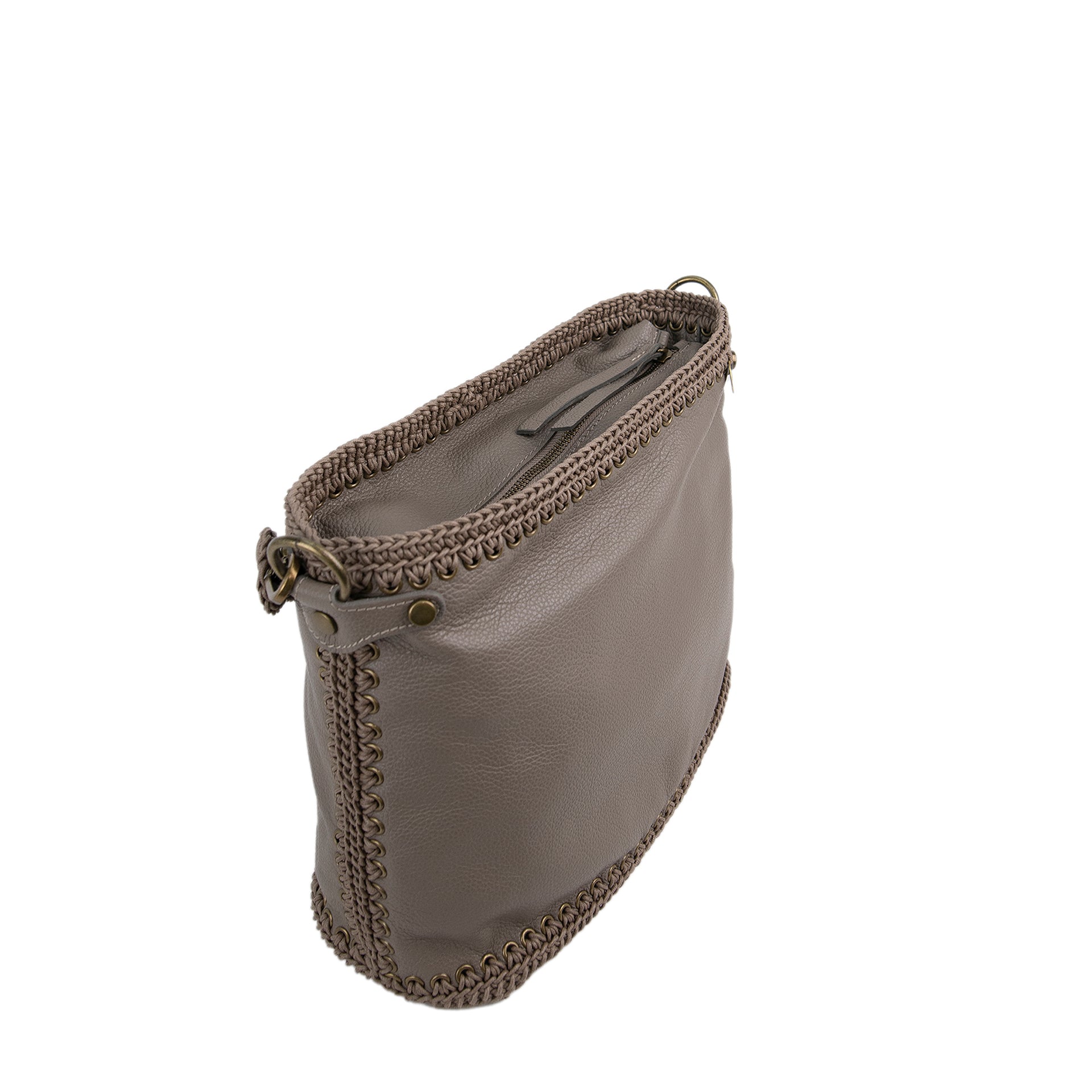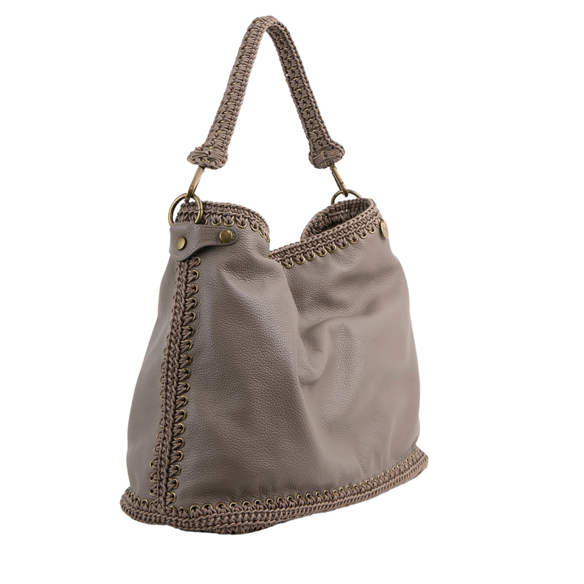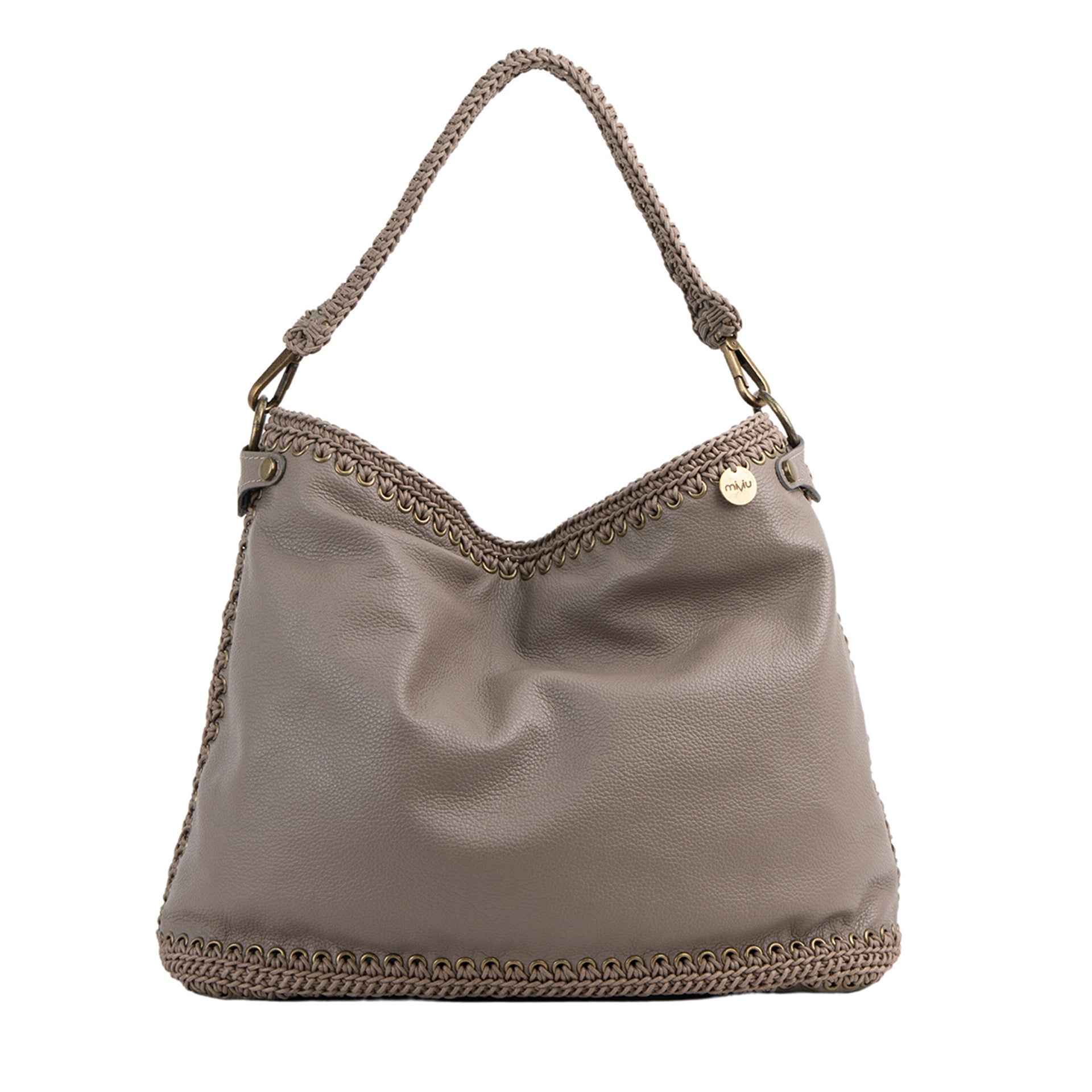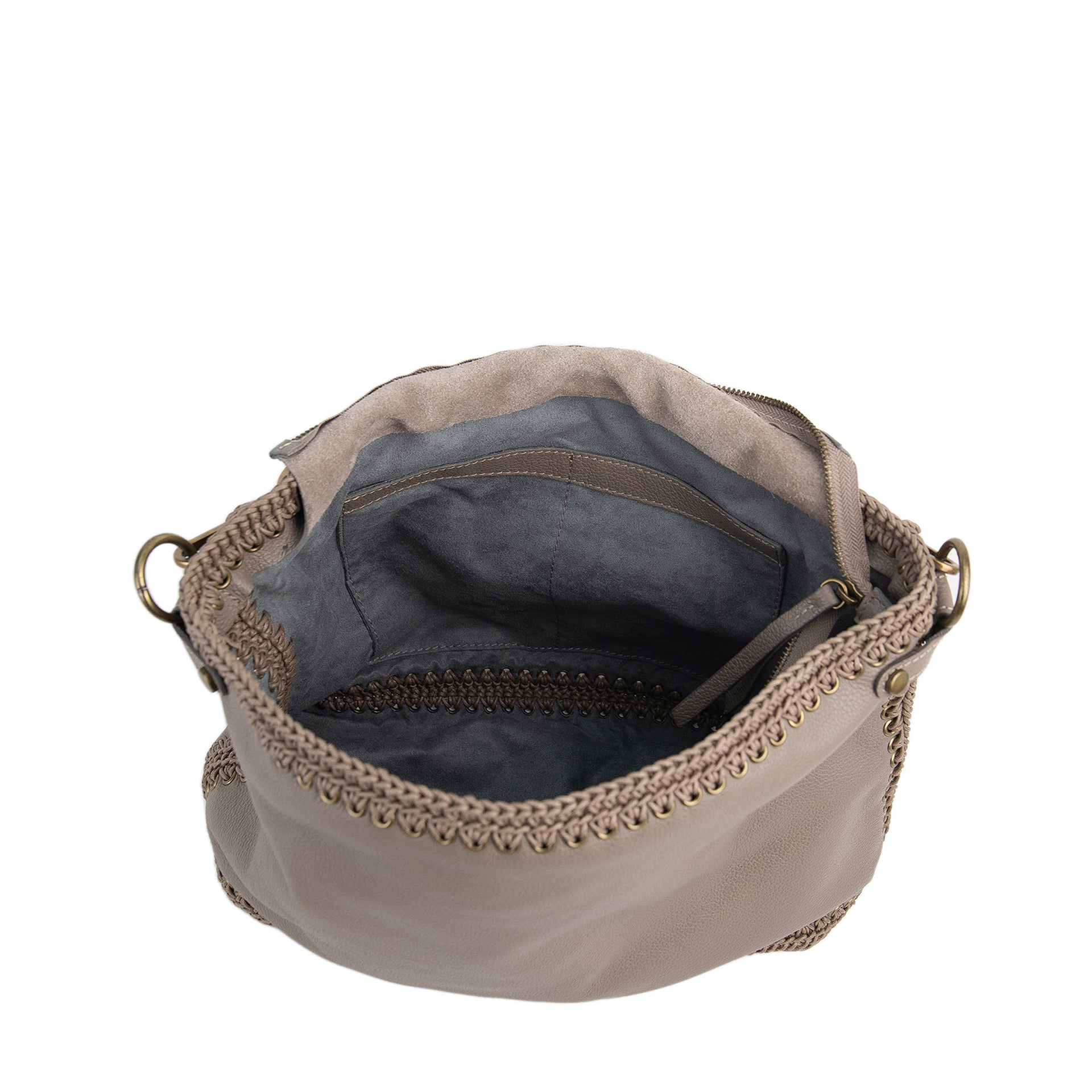 Ida L è una borsa hobo di grandi dimensioni, realizzata cucendo a mano all'uncinetto i pannelli in pelle. Tutto il lavoro all'uncinetto è realizzato con un cordoncino di cotone cerato, molto resistente. La pelle è di vitello con un tocco delicato. L'interno della borsa ha la parte in pelle foderata in un unico pezzo e si possono vedere tutte le lavorazioni. La borsa è dotata di una tracolla che può essere allungata e può essere indossata sia come borsa a spalla che come borsa a tracolla. Il manico è lavorato a mano coordinato alla borsa. All'interno è presente una tasca con zip e due tasche aperte. La parte superiore della borsa è chiusa da una zip.