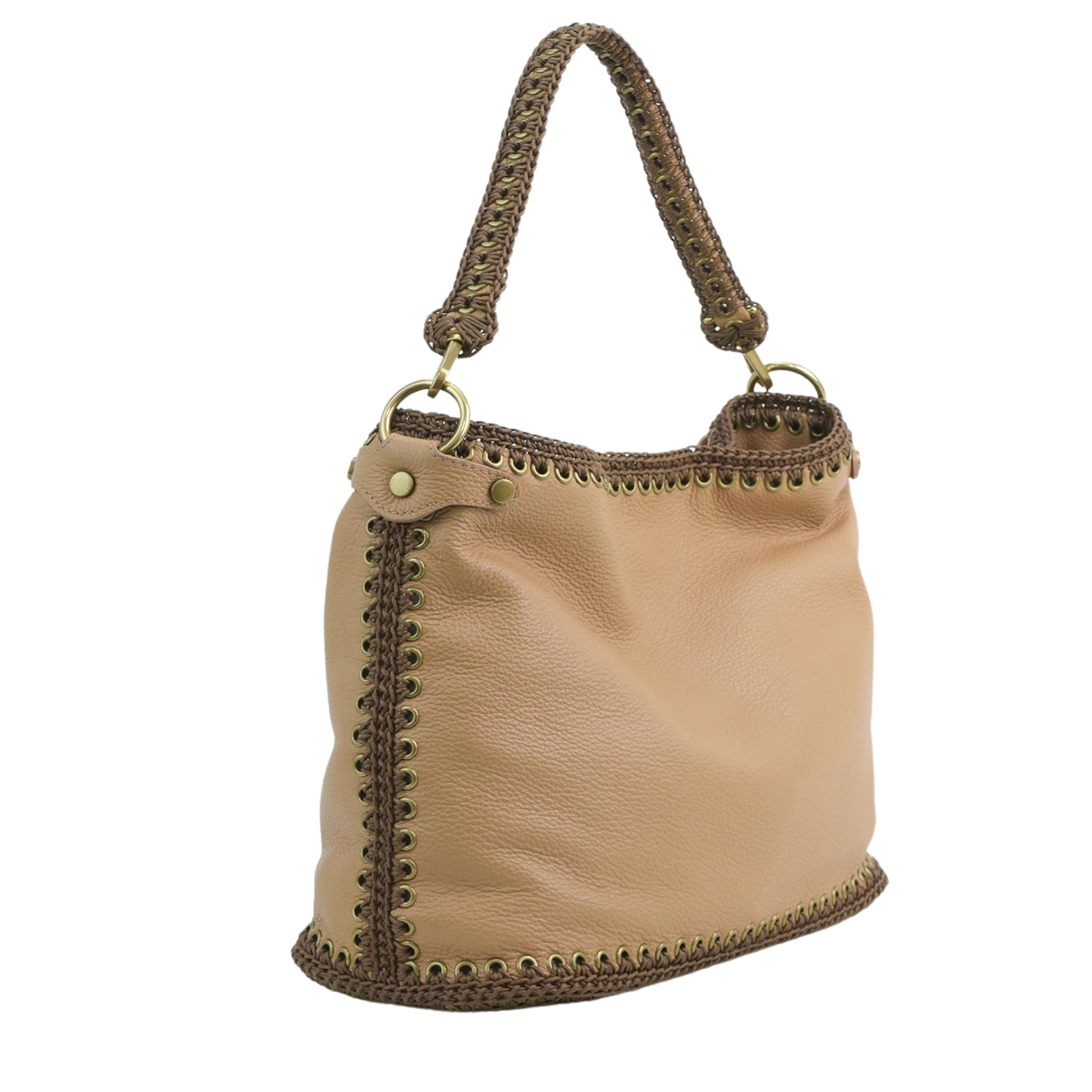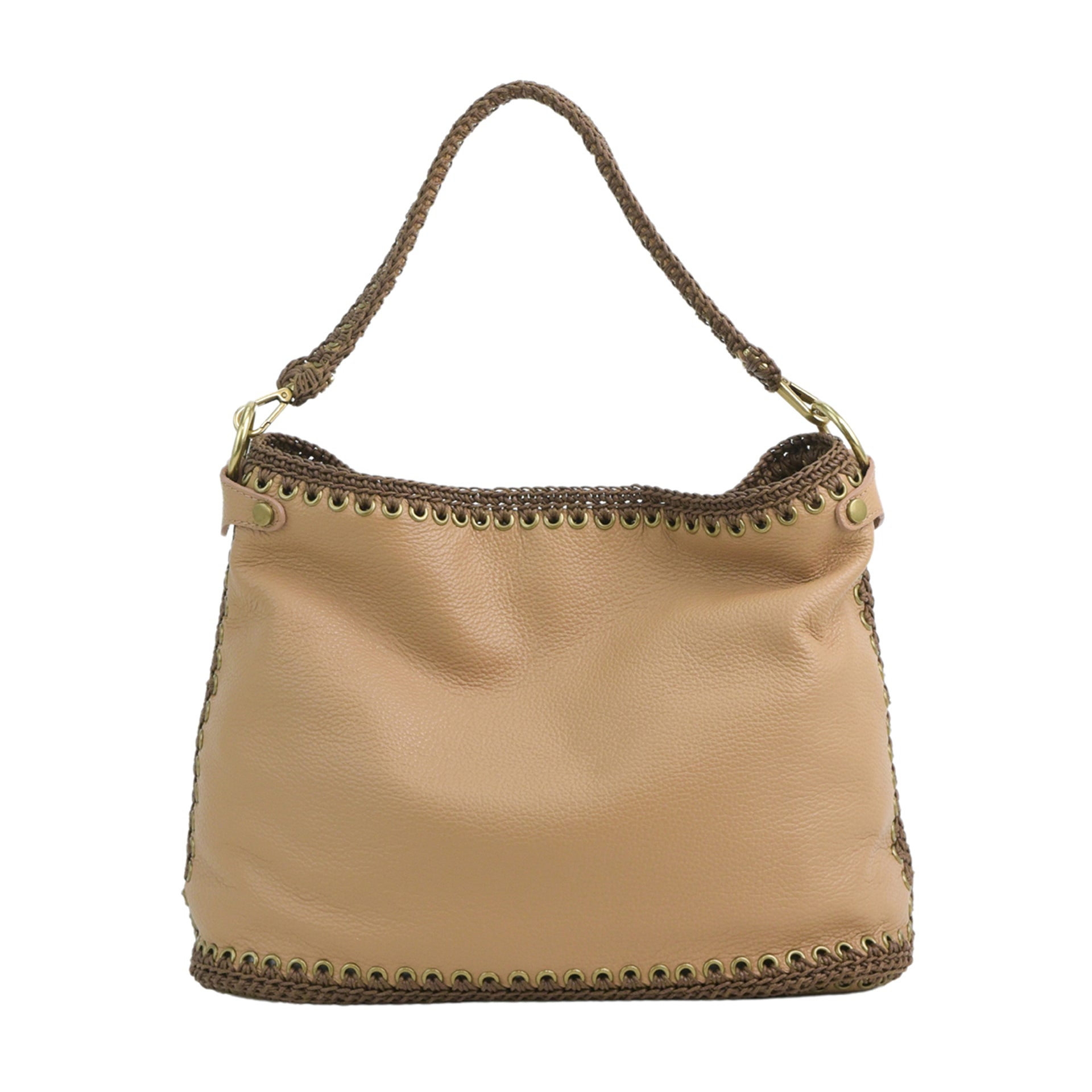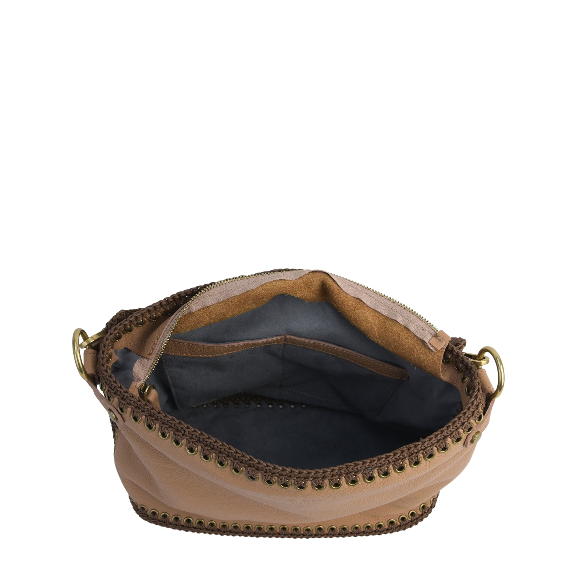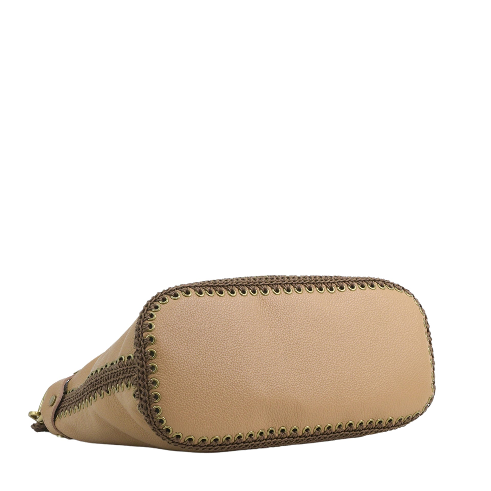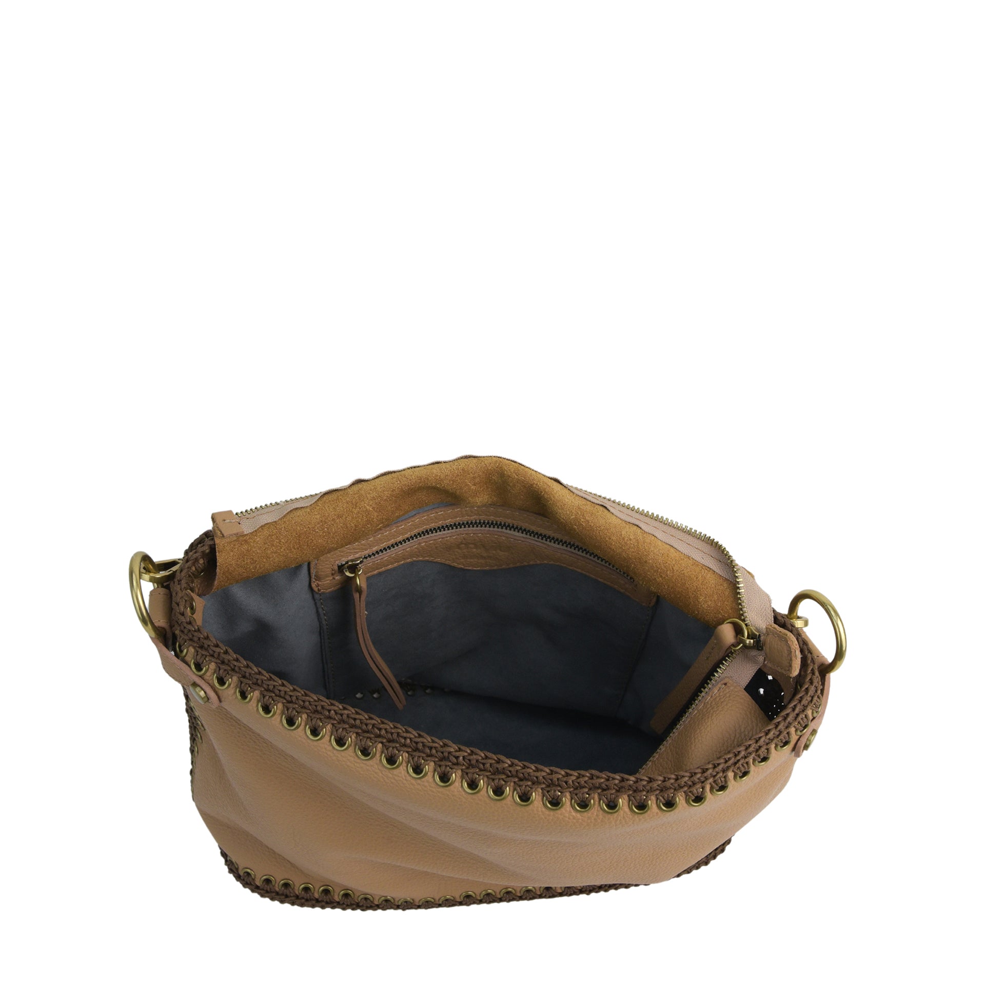 Ida M è una borsa hobo di medio-grandi dimensioni, realizzata cucendo a mano all'uncinetto i pannelli in pelle. Tutto il lavoro all'uncinetto è realizzato con un cordoncino di cotone cerato, molto resistente. La pelle è di vitello con un tocco delicato. L'interno della borsa ha la parte in pelle foderata in un unico pezzo e si possono vedere tutte le lavorazioni. La borsa è dotata di una tracolla che può essere allungata e può essere indossata sia come borsa a spalla che come borsa a tracolla. Il manico è lavorato a mano coordinato alla borsa. All'interno è presente una tasca con zip e due tasche aperte. La parte superiore della borsa è chiusa da una zip.