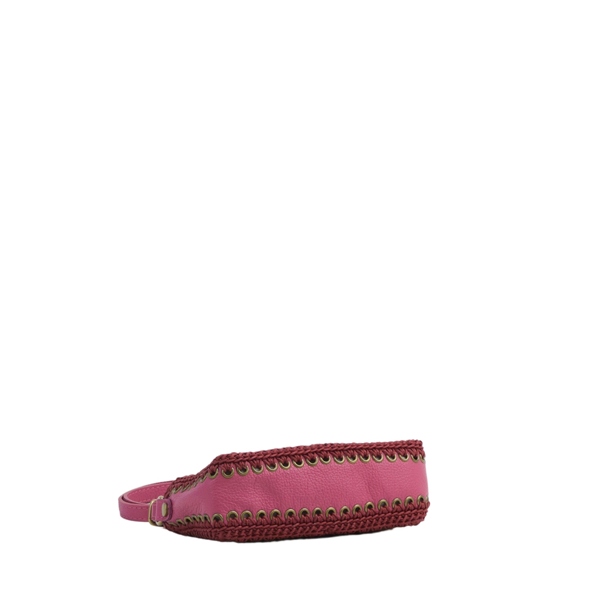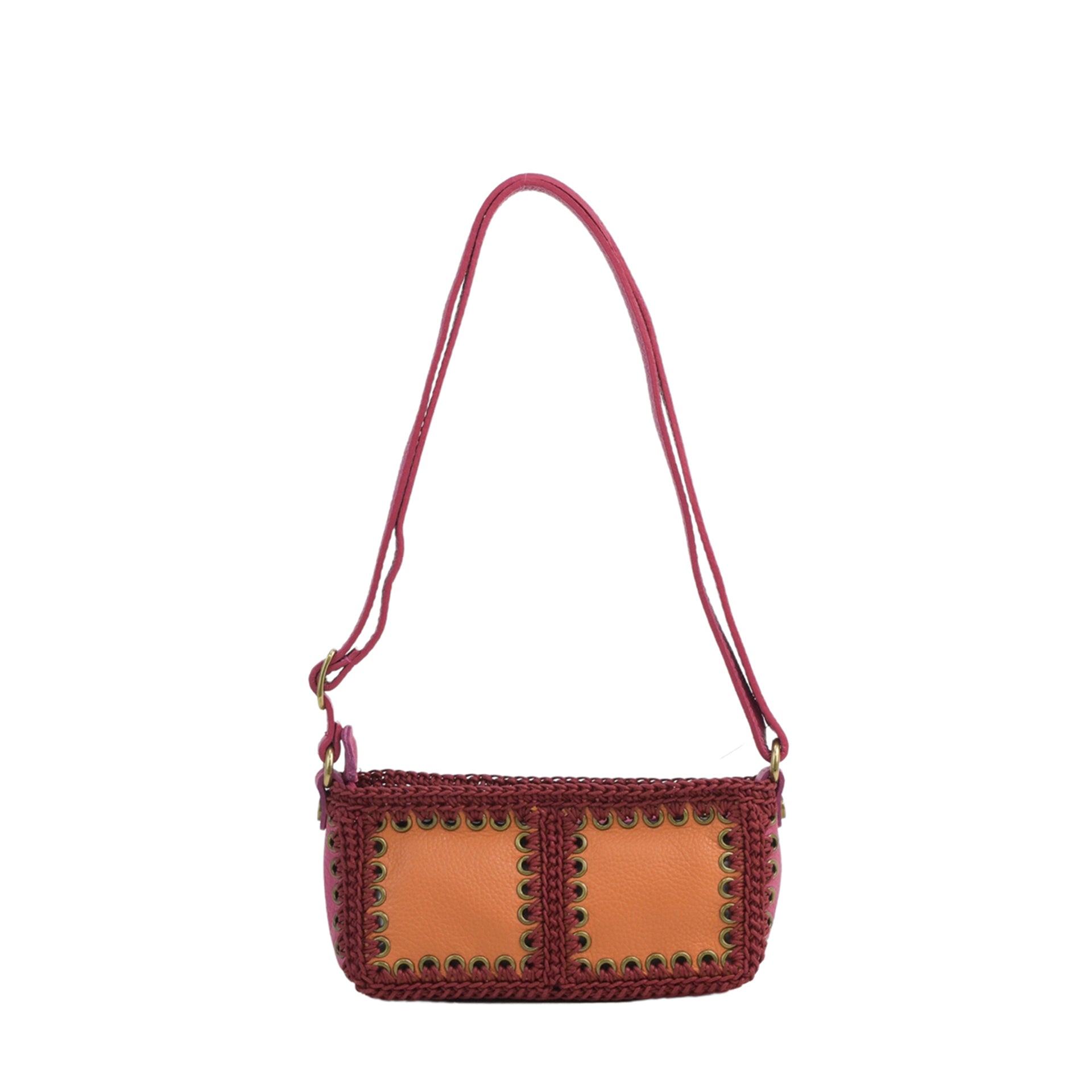 Iris è una borsa piccola di forma rettangolare realizzata cucendo a mano all'uncinetto i pannelli quadrati di pelle infine uniti a formare i pannelli. Tutto il lavoro all'uncinetto è realizzato con un cordoncino di cotone cerato, molto resistente. La pelle è di vitello con un tocco delicato. L'interno della borsa ha la parte in pelle foderata in un unico pezzo e si possono vedere tutte le lavorazioni. Con una tracolla allungabile, in modo da poterla indossare come borsa a tracolla e a bandoliera. All'interno si trova una tasca aperta. La parte superiore della borsa è chiusa da una lampo.