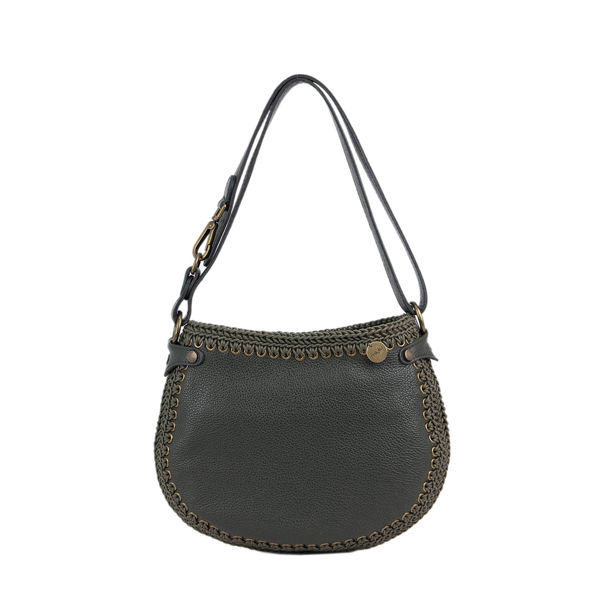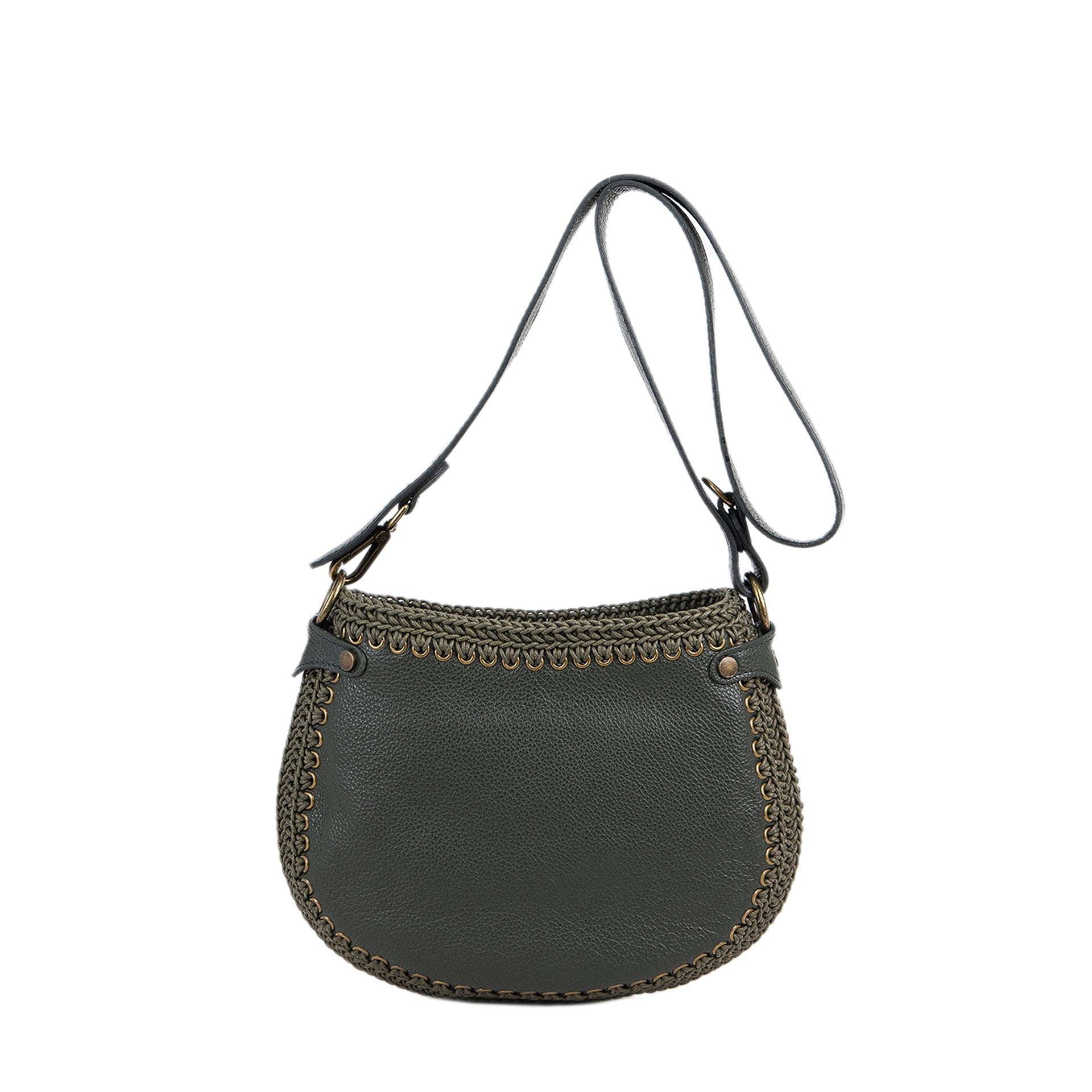 Mila M è una borsa di medie dimensioni, realizzata cucendo a mano all'uncinetto i pannelli di pelle. Tutto il lavoro all'uncinetto è realizzato con un cordoncino di cotone cerato, molto resistente. La pelle è di vitello con un tocco delicato. L'interno della borsa ha la parte in pelle foderata in un unico pezzo e si possono vedere tutte le lavorazioni. La tracolla può essere allungata, in modo da poterla indossare come borsa a spalla o come borsa a tracolla. All'interno si trovano una tasca con cerniera e due tasche aperte. La parte superiore della borsa è chiusa da una zip.