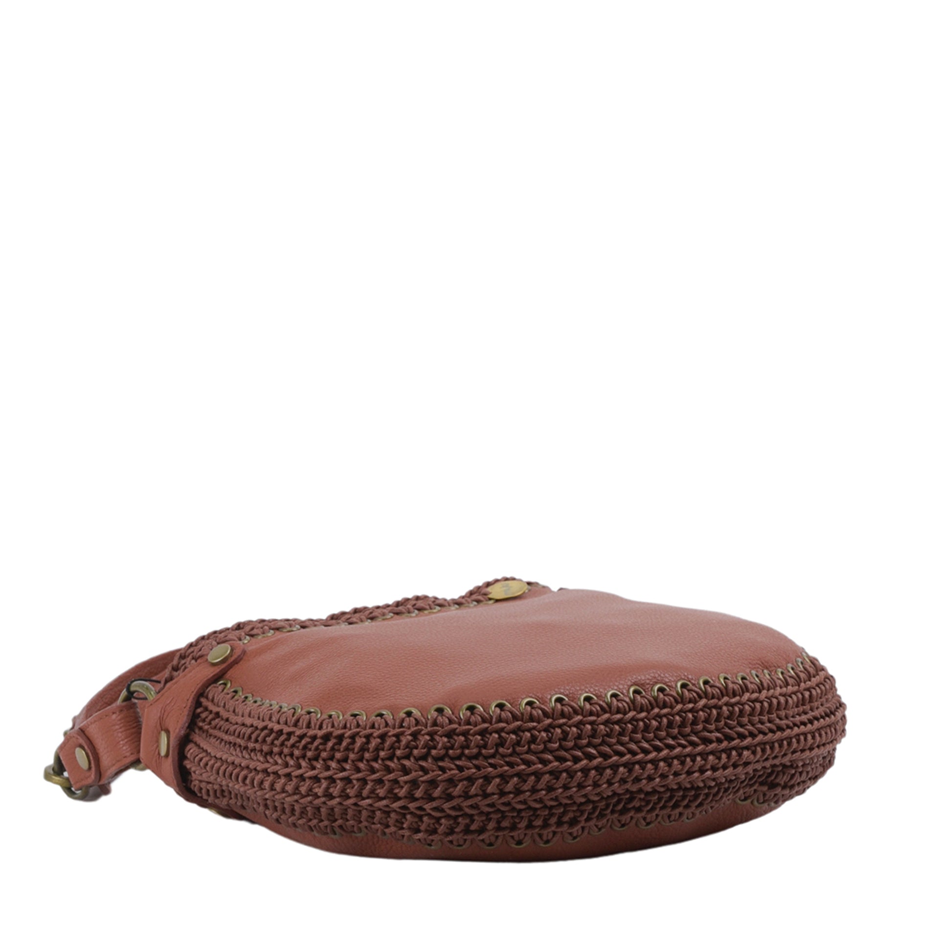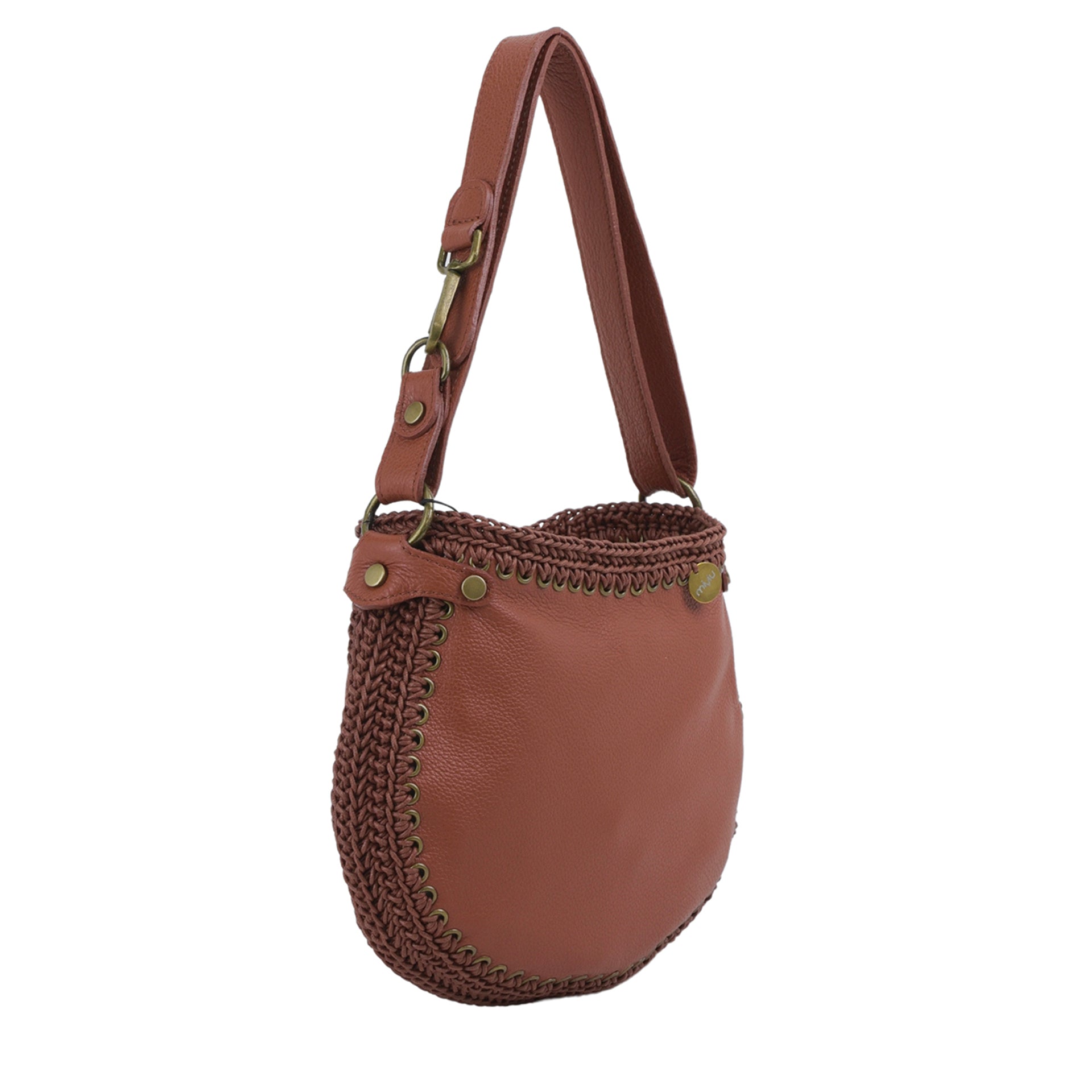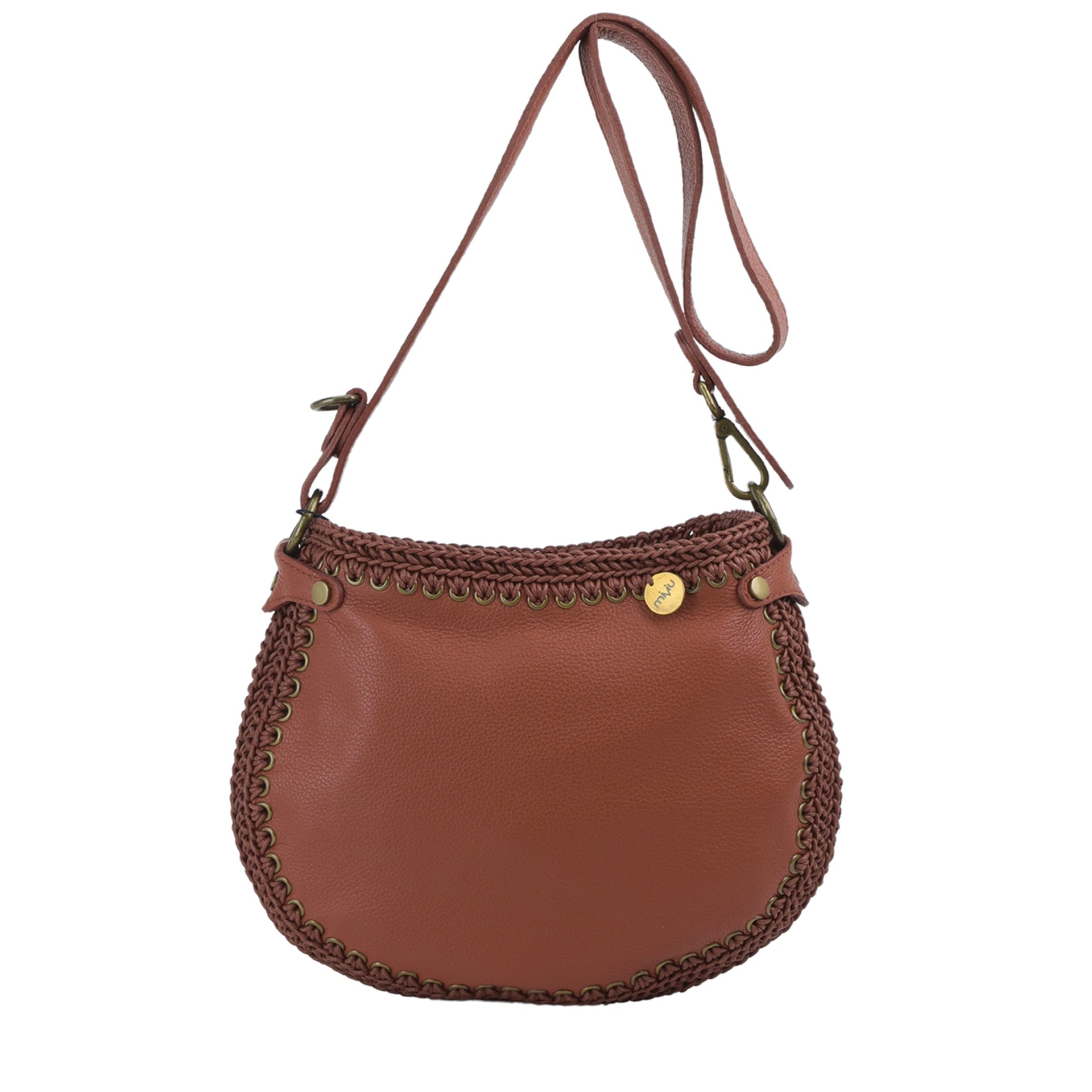 Mila M è una borsa di medie dimensioni, realizzata cucendo a mano all'uncinetto i pannelli di pelle. Tutto il lavoro all'uncinetto è realizzato con un cordoncino di cotone cerato, molto resistente. La pelle è di vitello con un tocco delicato. L'interno della borsa ha la parte in pelle foderata in un unico pezzo e si possono vedere tutte le lavorazioni. La tracolla può essere allungata, in modo da poterla indossare come borsa a spalla o come borsa a tracolla. All'interno si trovano una tasca con cerniera e due tasche aperte. La parte superiore della borsa è chiusa da una zip.