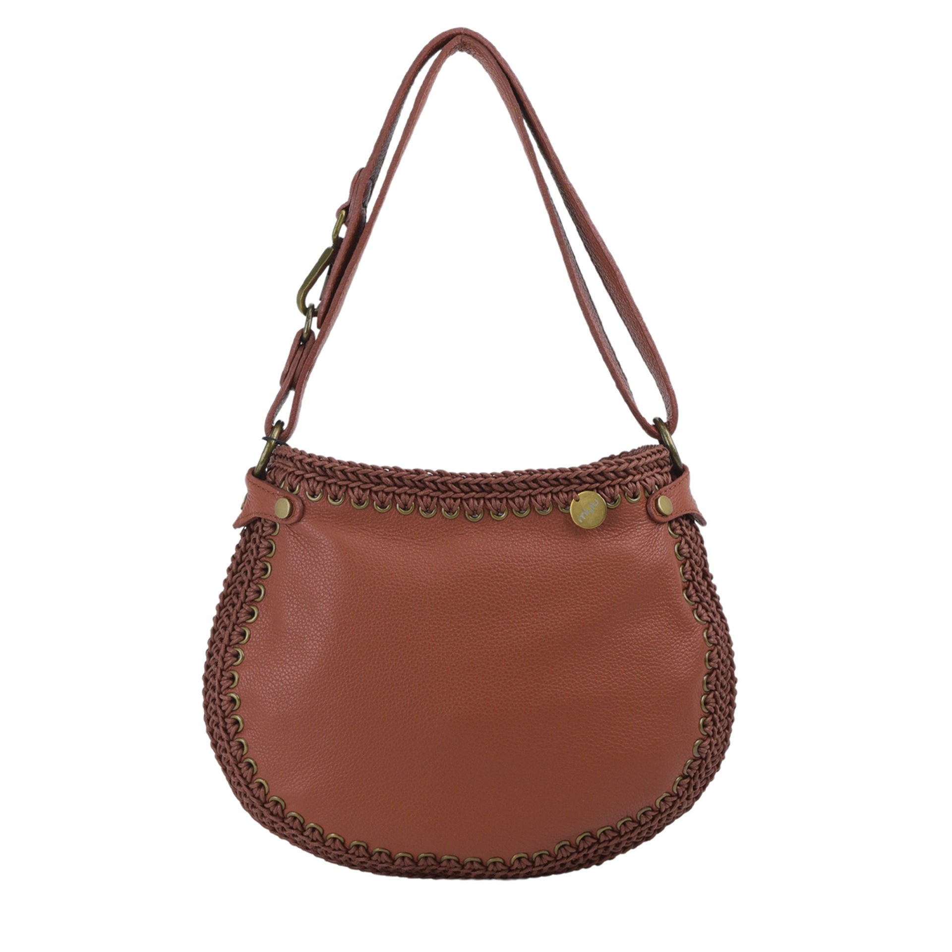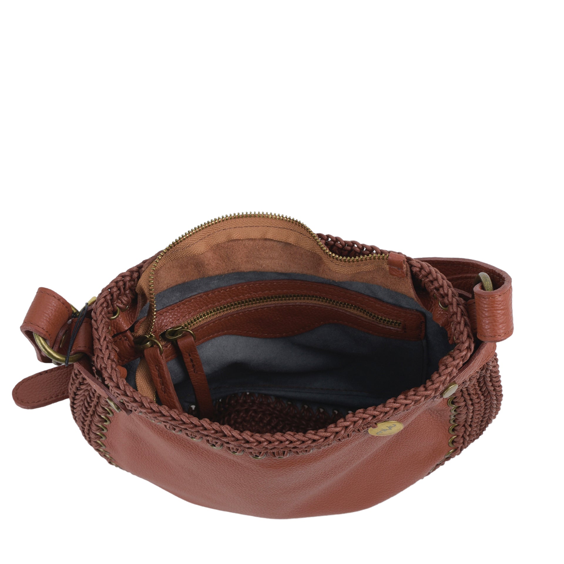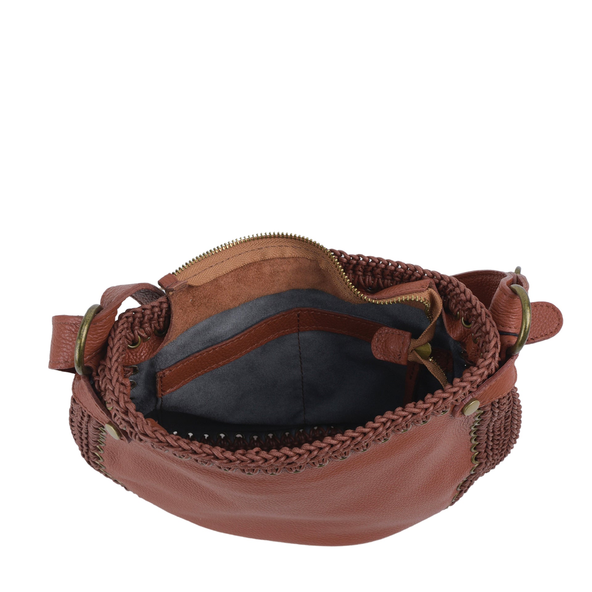 Mila M è una borsa di medie dimensioni, realizzata cucendo a mano all'uncinetto i pannelli di pelle. Tutto il lavoro all'uncinetto è realizzato con un cordoncino di cotone cerato, molto resistente. La pelle è di vitello con un tocco delicato. L'interno della borsa ha la parte in pelle foderata in un unico pezzo e si possono vedere tutte le lavorazioni. La tracolla può essere allungata, in modo da poterla indossare come borsa a spalla o come borsa a tracolla. All'interno si trovano una tasca con cerniera e due tasche aperte. La parte superiore della borsa è chiusa da una zip.