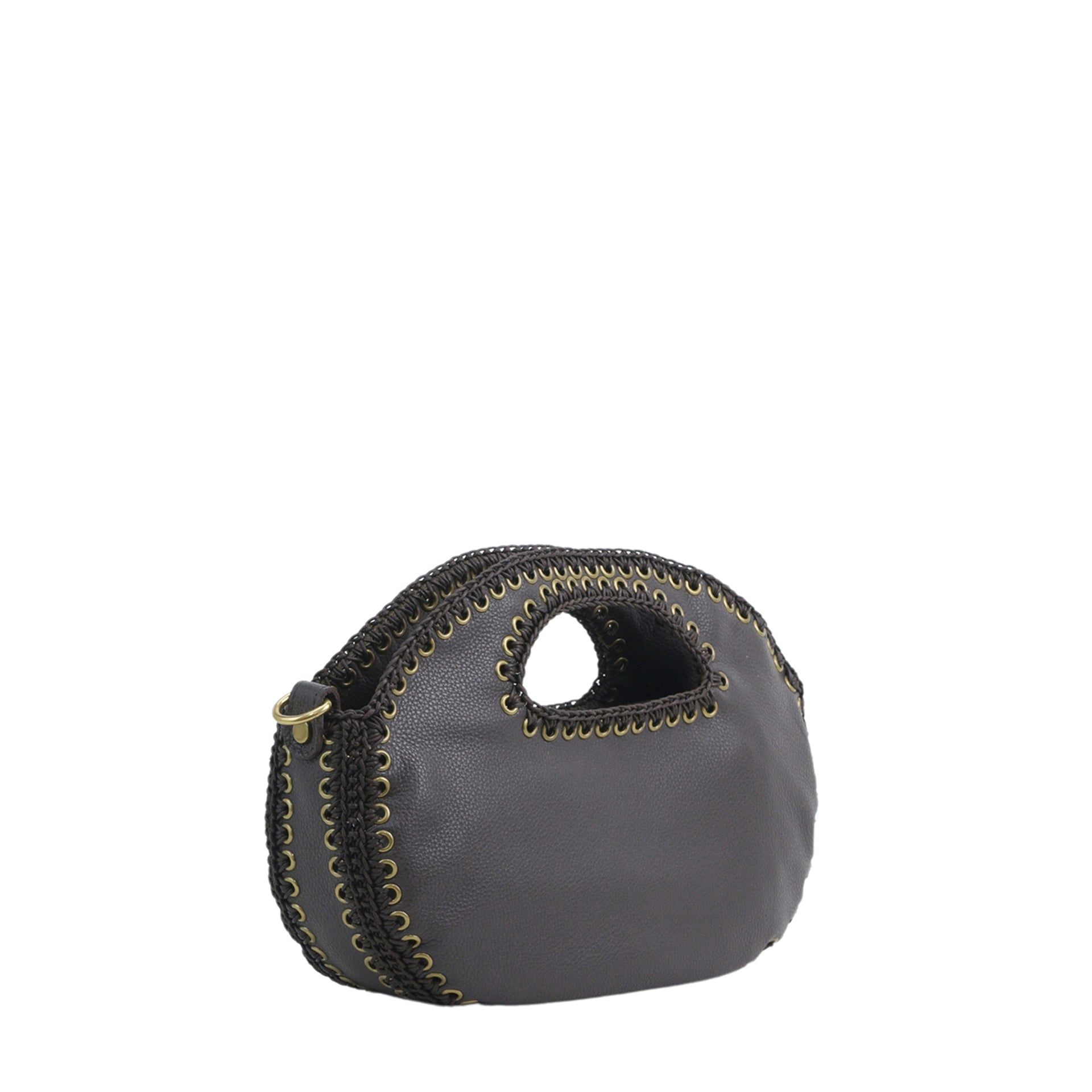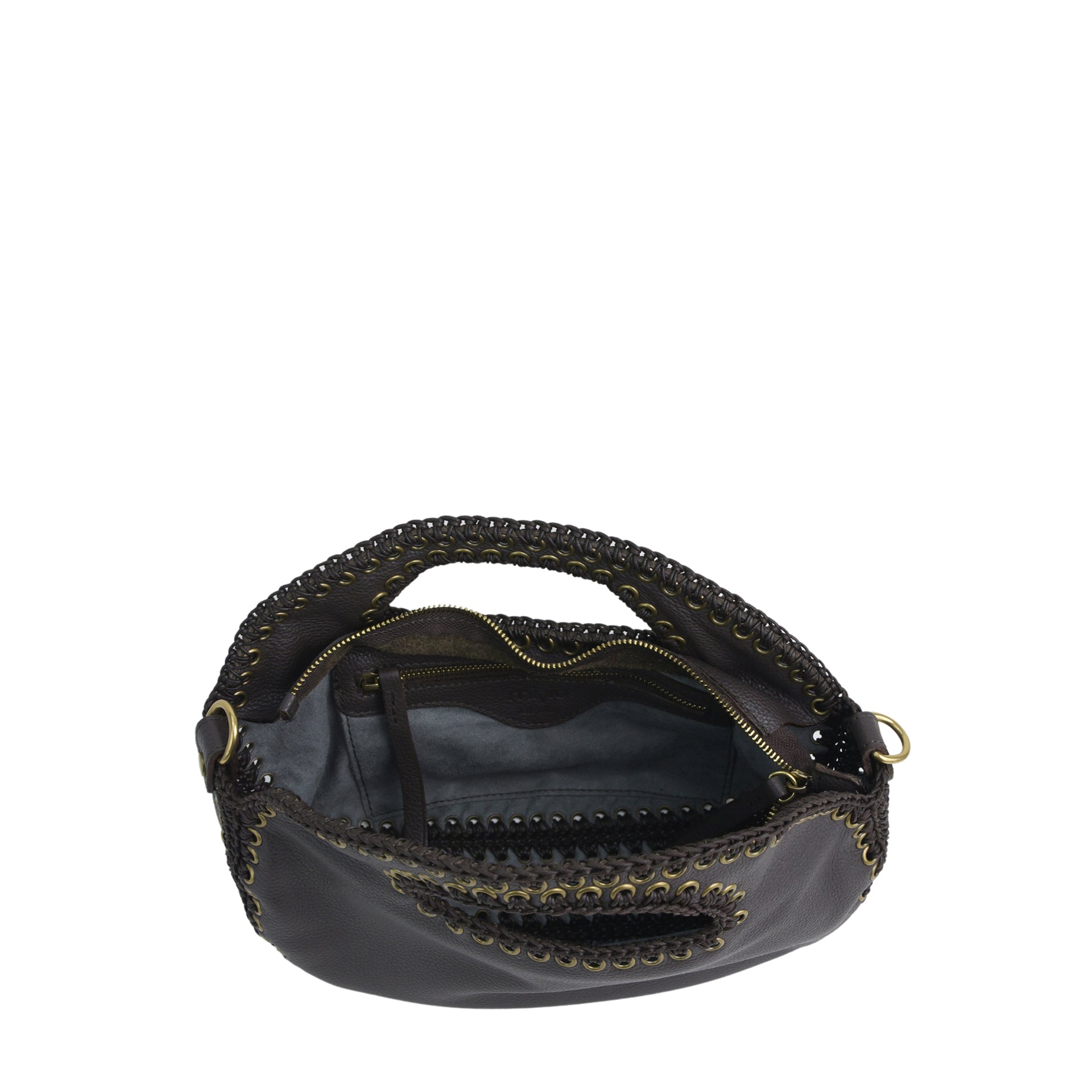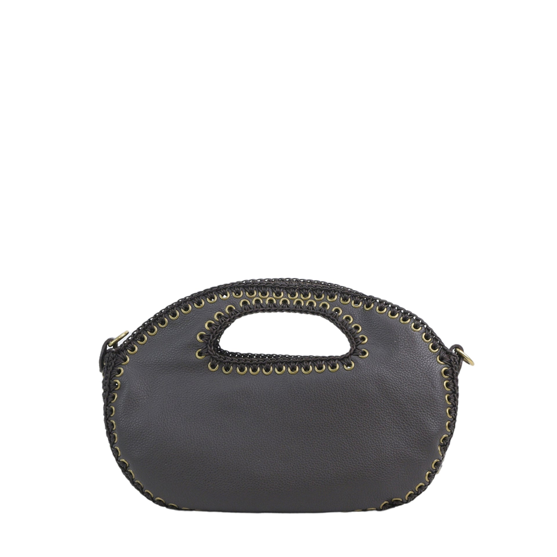 Nina M è una pochette realizzata cucendo a mano all'uncinetto i pannelli in pelle. Tutto il lavoro all'uncinetto è realizzato con un cordoncino di cotone cerato, molto resistente. La pelle è di vitello con un tocco delicato. L'interno della borsa ha la parte in pelle foderata in un unico pezzo e si possono vedere tutte le lavorazioni. Dotata di una tracolla, la borsa può essere indossata come borsa a mano o come borsa a tracolla. All'interno si trovano una tasca con cerniera e due tasche aperte. La parte superiore della borsa è chiusa da una zip.