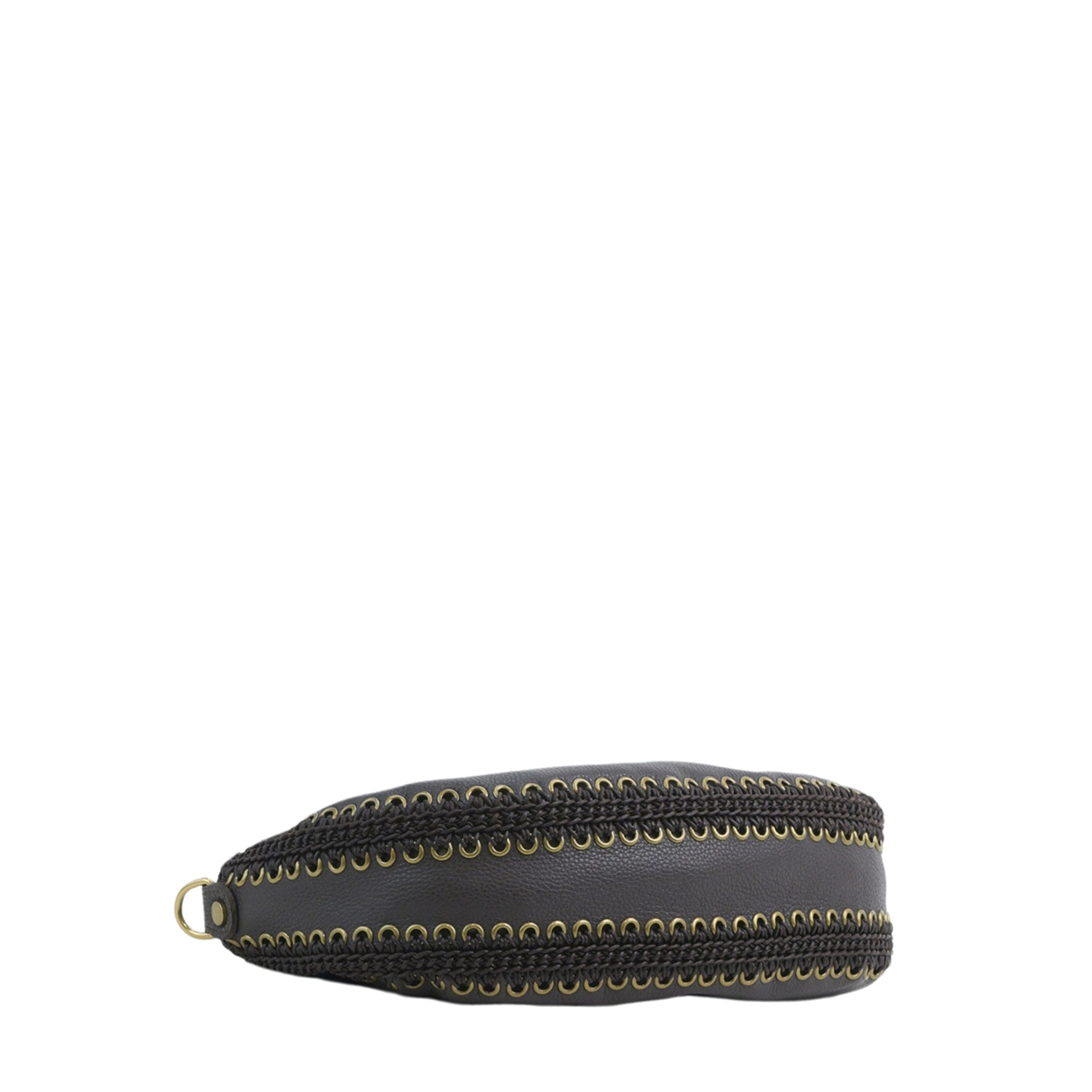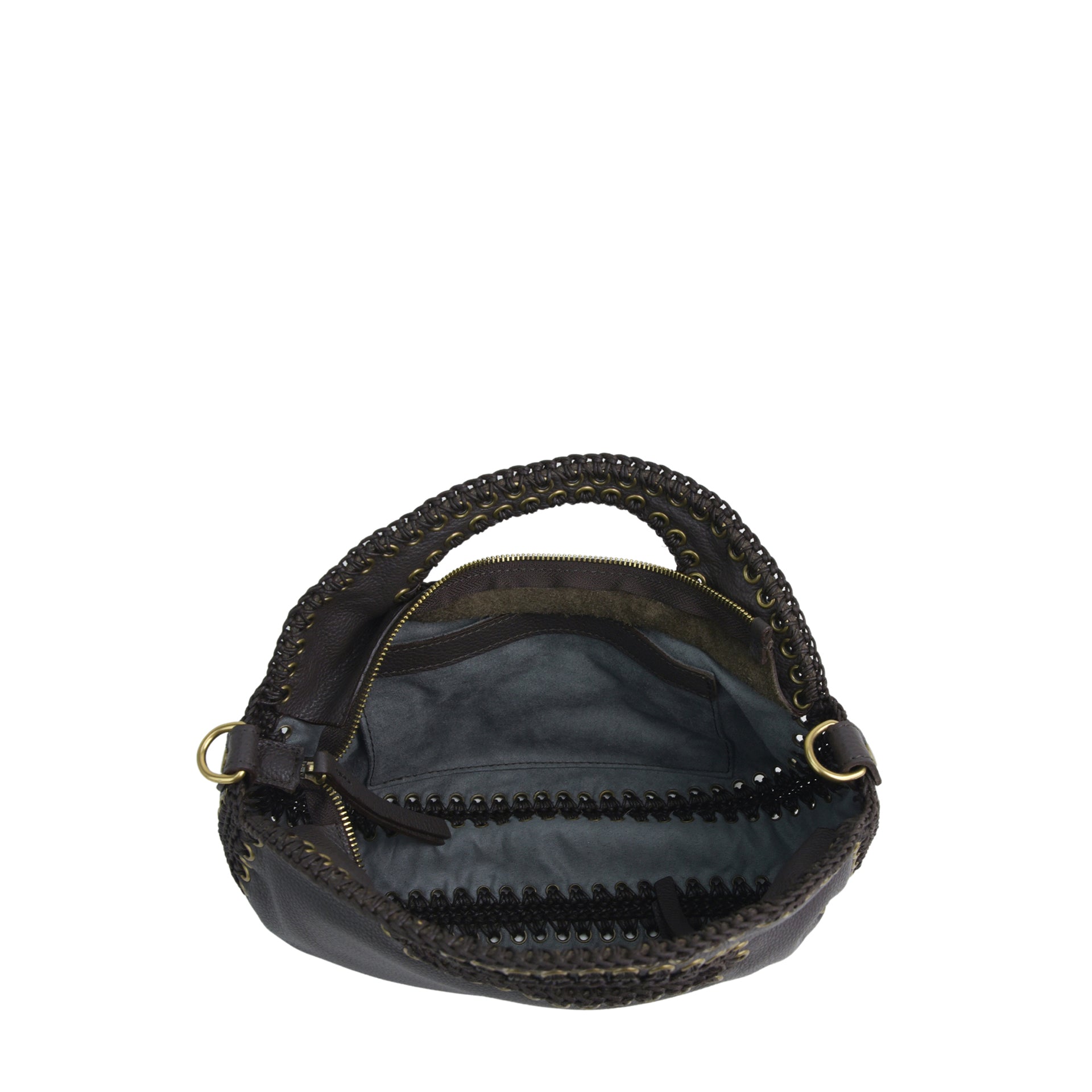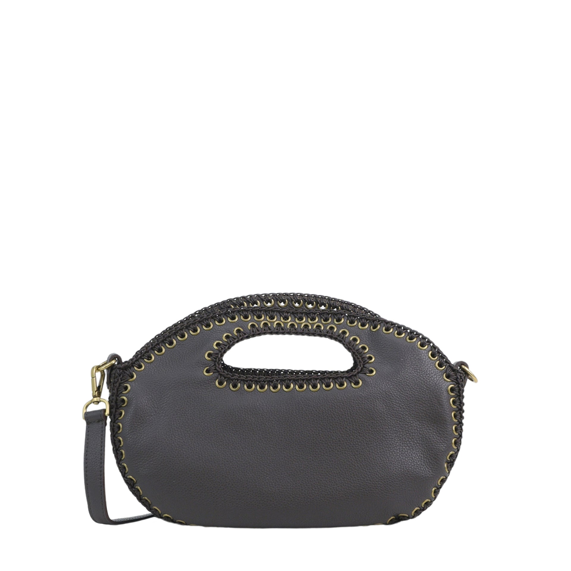 Nina M è una pochette realizzata cucendo a mano all'uncinetto i pannelli in pelle. Tutto il lavoro all'uncinetto è realizzato con un cordoncino di cotone cerato, molto resistente. La pelle è di vitello con un tocco delicato. L'interno della borsa ha la parte in pelle foderata in un unico pezzo e si possono vedere tutte le lavorazioni. Dotata di una tracolla, la borsa può essere indossata come borsa a mano o come borsa a tracolla. All'interno si trovano una tasca con cerniera e due tasche aperte. La parte superiore della borsa è chiusa da una zip.