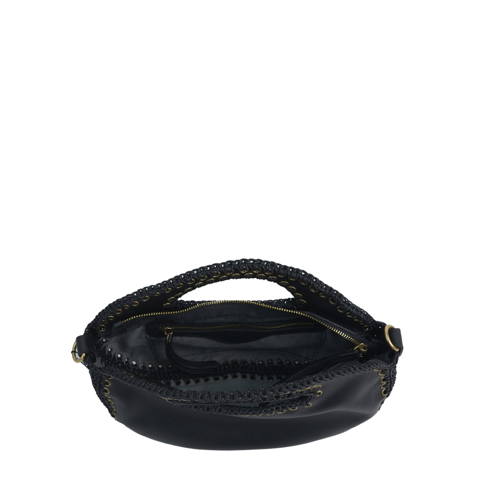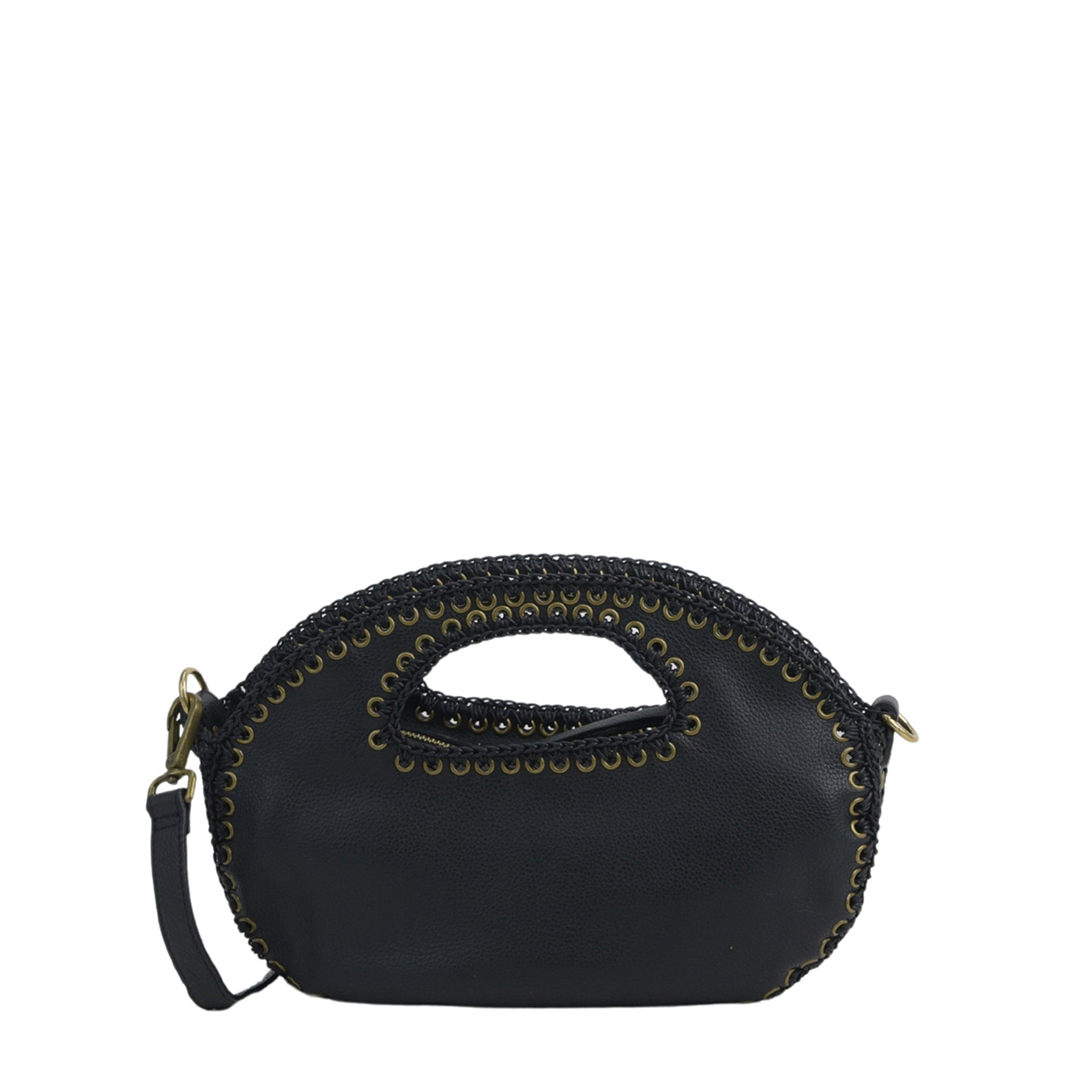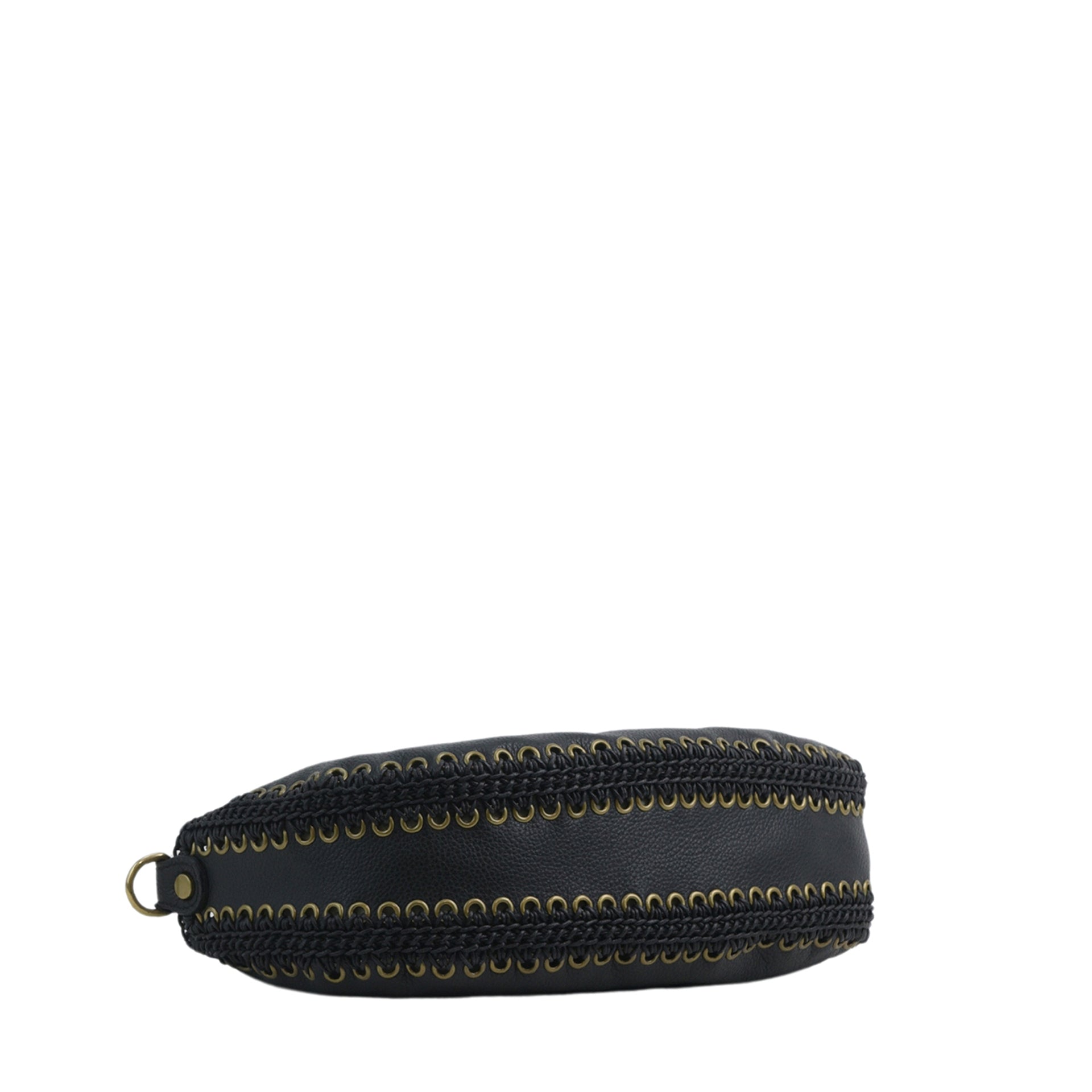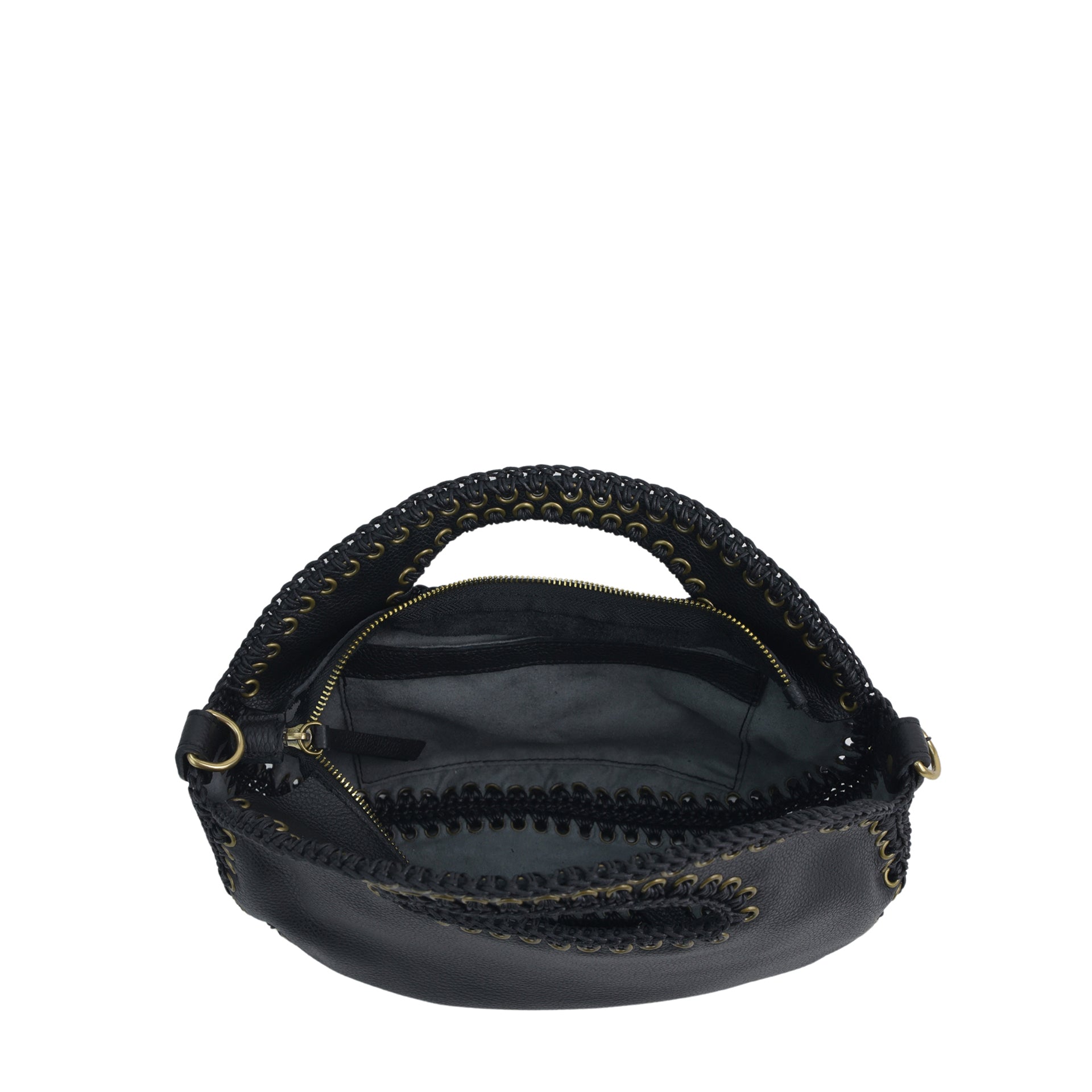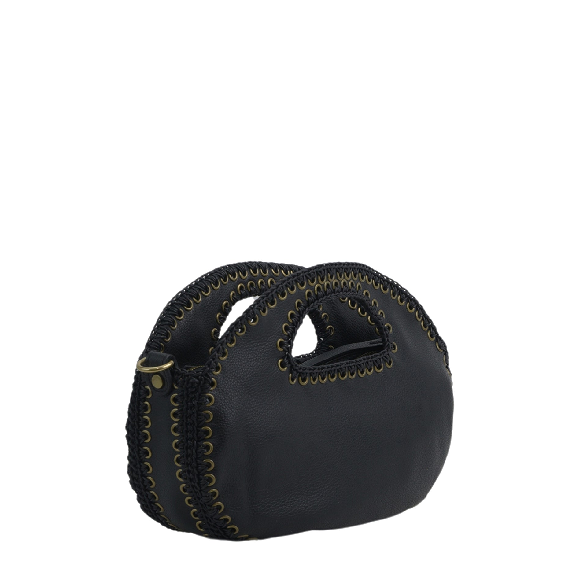 Nina M è una pochette realizzata cucendo a mano all'uncinetto i pannelli in pelle. Tutto il lavoro all'uncinetto è realizzato con un cordoncino di cotone cerato, molto resistente. La pelle è di vitello con un tocco delicato. L'interno della borsa ha la parte in pelle foderata in un unico pezzo e si possono vedere tutte le lavorazioni. Dotata di una tracolla, la borsa può essere indossata come borsa a mano o come borsa a tracolla. All'interno si trovano una tasca con cerniera e due tasche aperte. La parte superiore della borsa è chiusa da una zip.